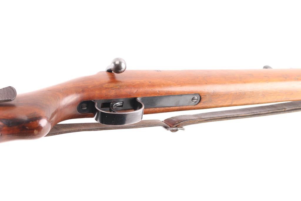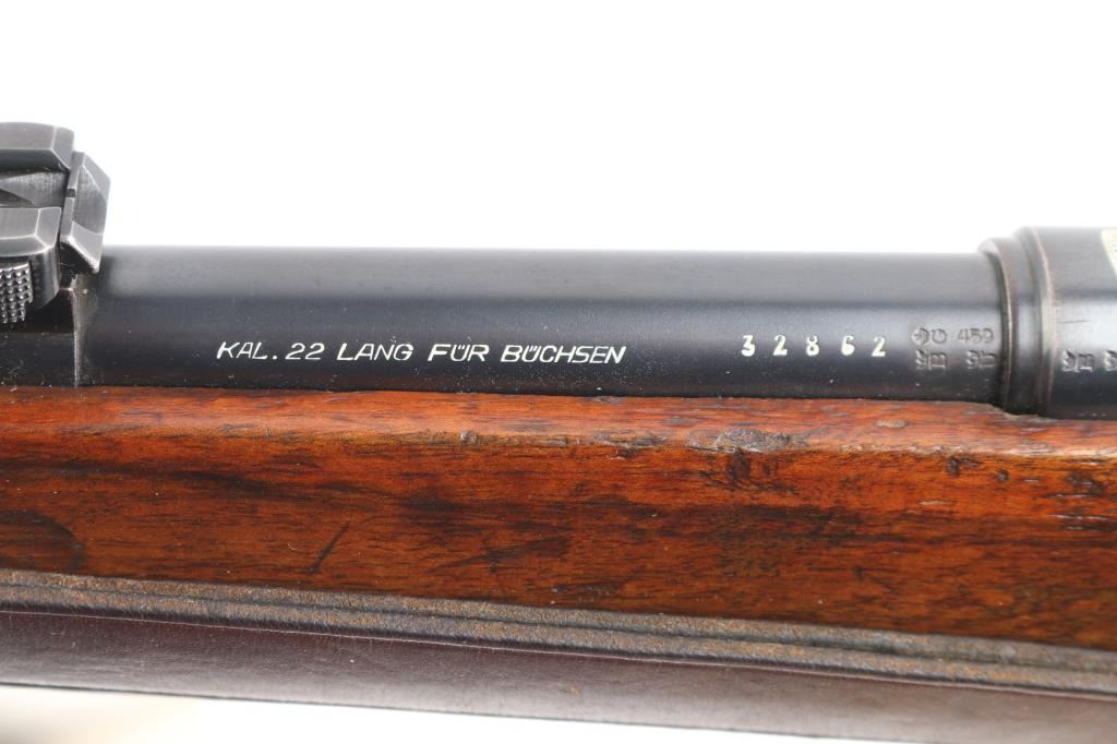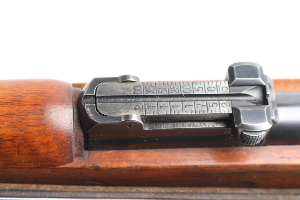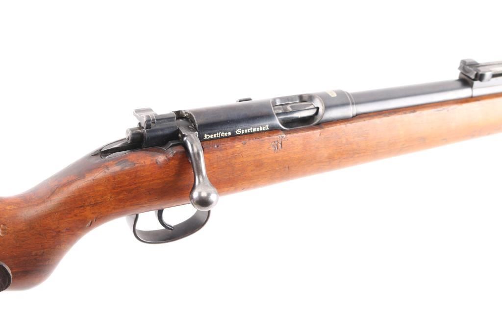 This pre war Mauser K98 style training rifle is equipped with a ramped triangle blade front sight and tangent rear sight graduated to 200 meters. Single shot. The left side of the 26" barrel at the breech end is marked "KAL. 22 LANG FUR BUCHSEN" followed by the serial number and "459" ahead of crown "B", "U" and "G" proof marks. The left of the receiver is marked with a crown "B" and "U" proof followed by the matching serial number and "MAUSER-WERKE A.G. OBERNDORF A.N." The top of the receiver is marked with the Mauser banner and "DEUTCHES SPORTMODELL" on the right rear. Mounted with a smooth one piece walnut pistol grip stock and handguard with bolt take-down disc in stock. Two barrel bands. Bore is excellent/bright. Original blue is about 94% with minor edge wear, handling wear on the bolt knob and friction wear on the bolt, wood is very good/sound with scratches/dings. Markings are highlighted in white. See "Training Rifles of Third Reich Germany" by Robert Simpson. A really nice one.NRA Condition-Near Excellent. C&R Firearm