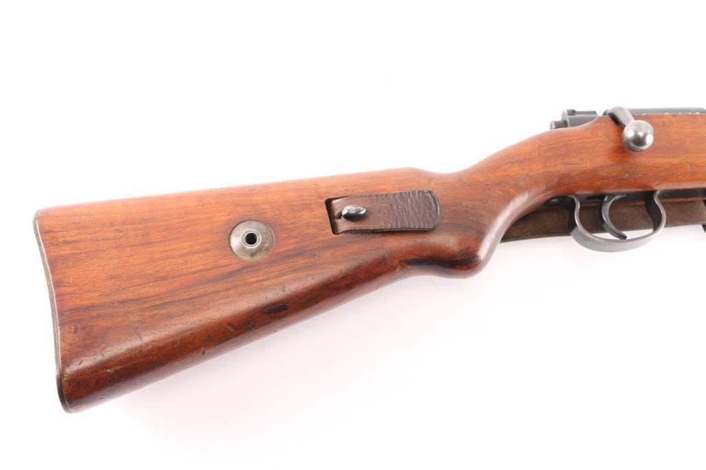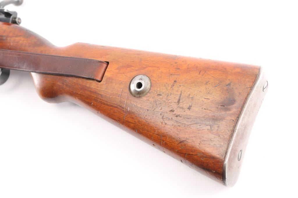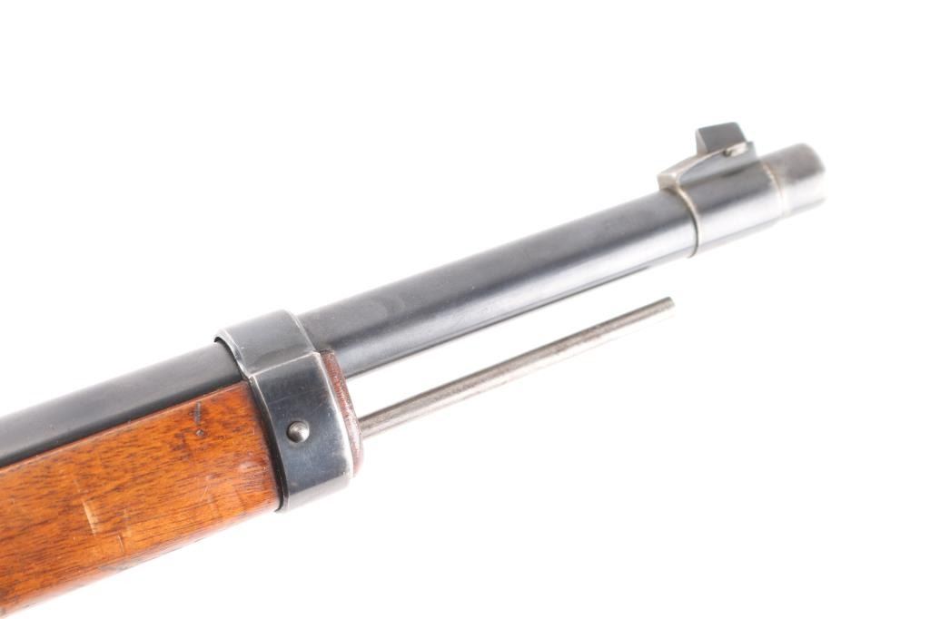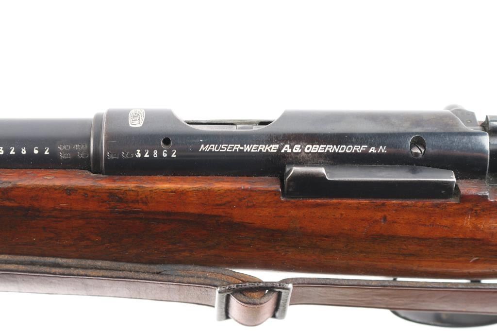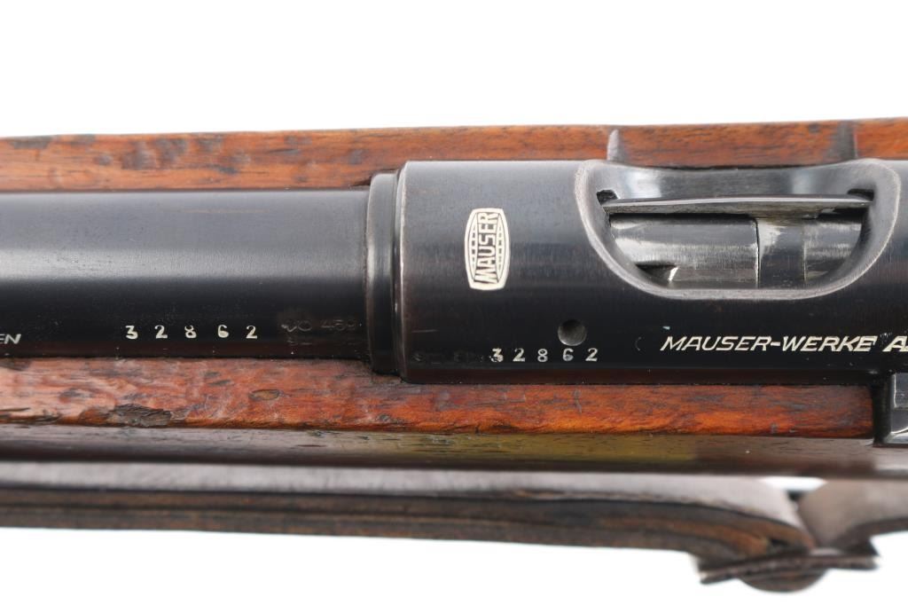 This pre war Mauser K98 style training rifle is equipped with a ramped triangle blade front sight and tangent rear sight graduated to 200 meters. Single shot. The left side of the 26" barrel at the breech end is marked "KAL. 22 LANG FUR BUCHSEN" followed by the serial number and "459" ahead of crown "B", "U" and "G" proof marks. The left of the receiver is marked with a crown "B" and "U" proof followed by the matching serial number and "MAUSER-WERKE A.G. OBERNDORF A.N." The top of the receiver is marked with the Mauser banner and "DEUTCHES SPORTMODELL" on the right rear. Mounted with a smooth one piece walnut pistol grip stock and handguard with bolt take-down disc in stock. Two barrel bands. Bore is excellent/bright. Original blue is about 94% with minor edge wear, handling wear on the bolt knob and friction wear on the bolt, wood is very good/sound with scratches/dings. Markings are highlighted in white. See "Training Rifles of Third Reich Germany" by Robert Simpson. A really nice one.NRA Condition-Near Excellent. C&R Firearm