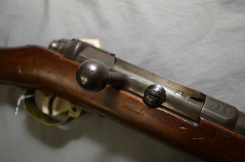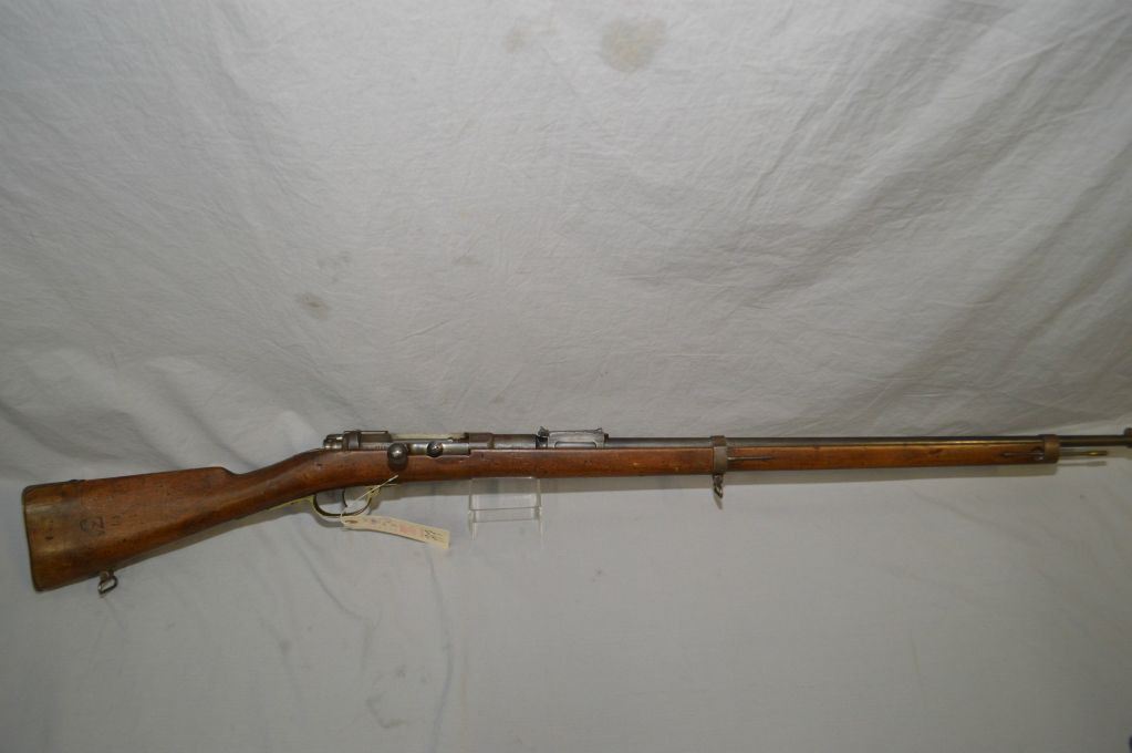 Mauser (St. Denis) Model 1871, dated 1883, 7mm cal. (?) possible necked from 11mm Mauser, full wood military rifle with 31" barrel [ Fading blue finish turned brown, mismatched numbers, good numbers on stock and butt plate, with sling swivels and cleaning rod] Serial: 4747