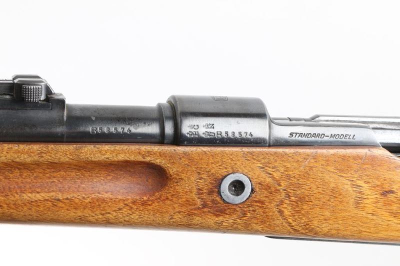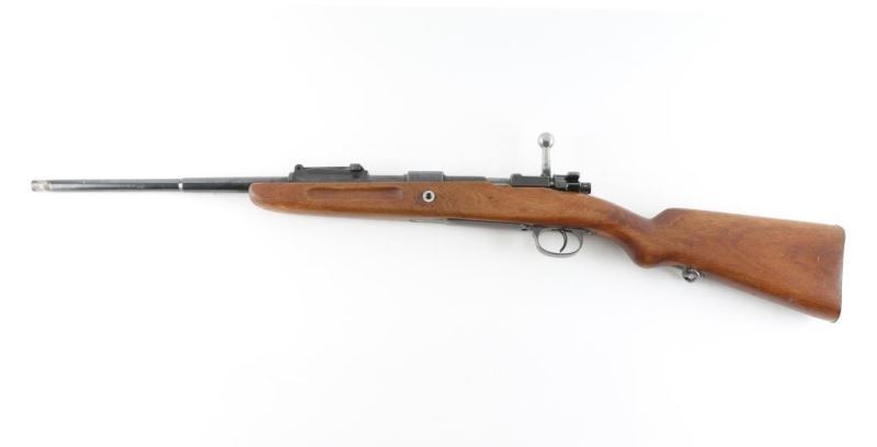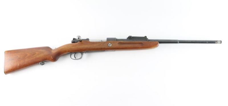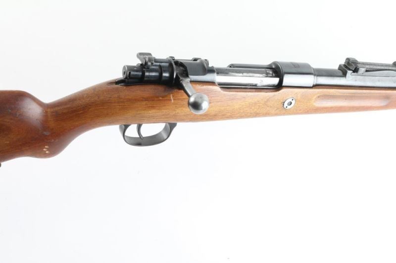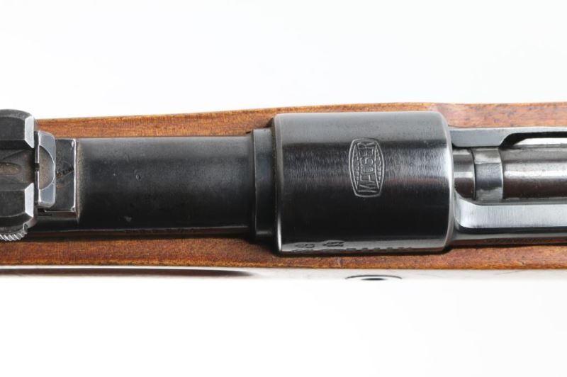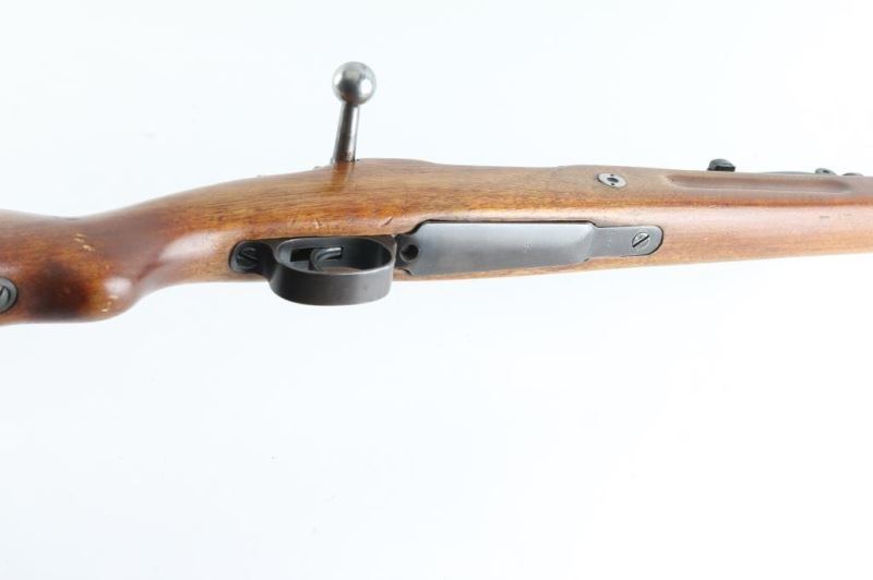 German manufactured military bolt action rifle has been partially sporterized. Features blued finish, 20" stepped barrel, front sight removed (leaving a step), tangent rear sight, manual safety, rear swivel, smooth metal buttplate, straight bolt handle. Semi pistol grip wood stock has been cut down, edges of grasping grooves appear lightly sanded. Bore is dark, poor to fair condition, with visible rifling. Retains 85% coverage of polished reblue on receiver & barrel with some erosion to markings. Bottom metal has brownish color bluing. Bolt handle and extractor are polished bright metal. Recoil lug bolts in stock are bright metal from sanding. Wood is good condition as altered. Stamped on bottom of chamber "(eagle) / WaA63", "36Dö238". Receiver marked "Waffenfabrik Mauser Oberndorf". Mauser banner on receiver is crisp. Numbers match on receiver & barrel, other numbers do not match. No number observed on bolt body. Condition is NRA Fair *** C&R Firearm ***