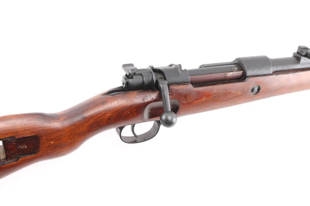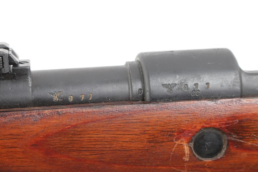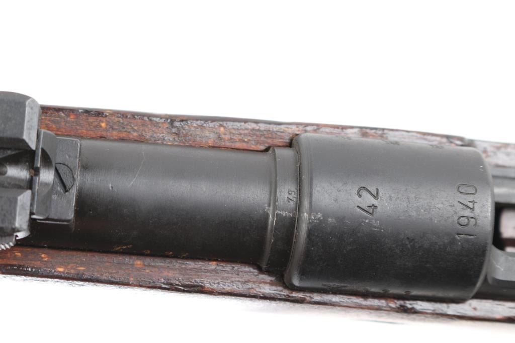 German military issue. WW2 era. 1940 dated receiver. 42 code. (Mauser, Oberndorf) Blued finish. Wood stock with bolt disassembly lug, thin metal buttplate (not cupped). 23.62" barrel. Serial number matched on receiver, barrel, & stock mismatched front band, and rear sight, "(77" eltro-penciled on floorplate, trigger assembly, bolt shroud, and safety lever. (Russian Capture ?) No markings observed on buttplate. "H" front barrel band. Eagle/swastika proofs, and waffenamts present. Wood is good shape, with small dings/dents present, has been varnished. Bore is dark/rough. Action is crisp/tight. metal finish is about 80% with edge/handling wear. Cleaning rod . Imported by TGI, marked on underside of barrel. NRA Condition-Fair (Bore). C&R Firearm.
