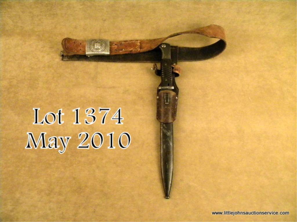 Mauser bayonet, hanger and belt in overall good to very good condition, bayonet is #7370a and DURKOPP at the hilt, considerable blue remaining on blade, nazi proofed on pommel, good grips, the metal sheath is overall good with erosion on thefront portion just under the leather hanger but showing considerable finish otherwise; hanger is in overall good condition with wear and scuffs and the tip of the retaining strap lost; the belt is in very good condition with scuffs and wear andthe belt buckle and clip are complete with the embossed “Gott Mit Uns” banner around the nazi spread eagle symbol. Est.: $150-$300.
