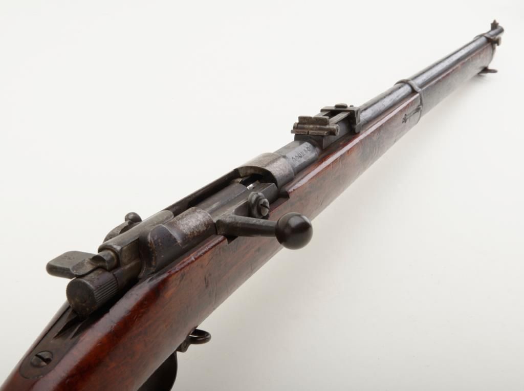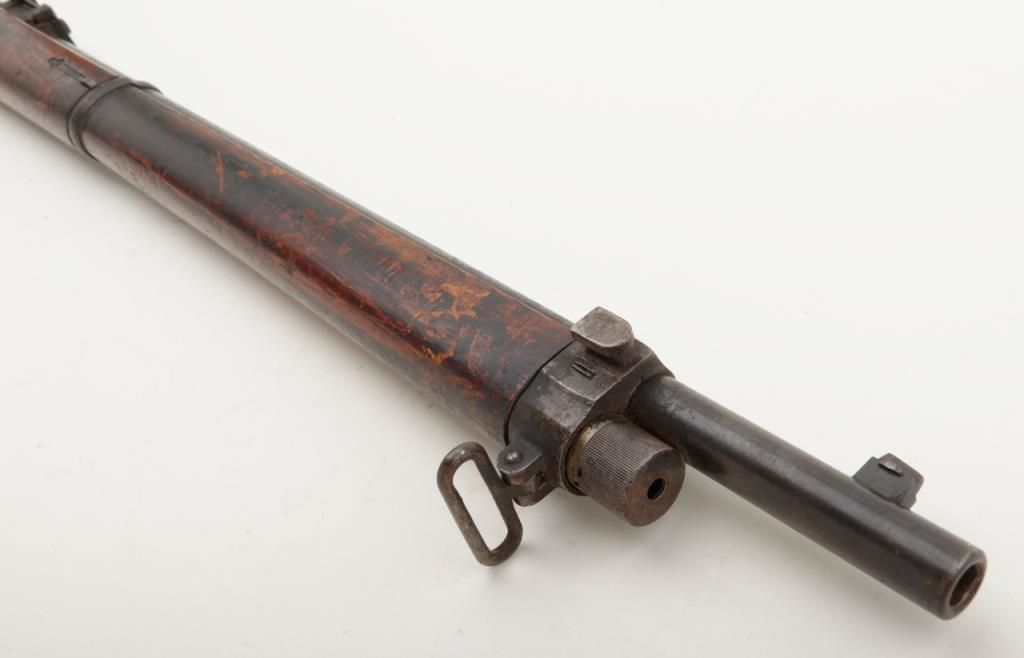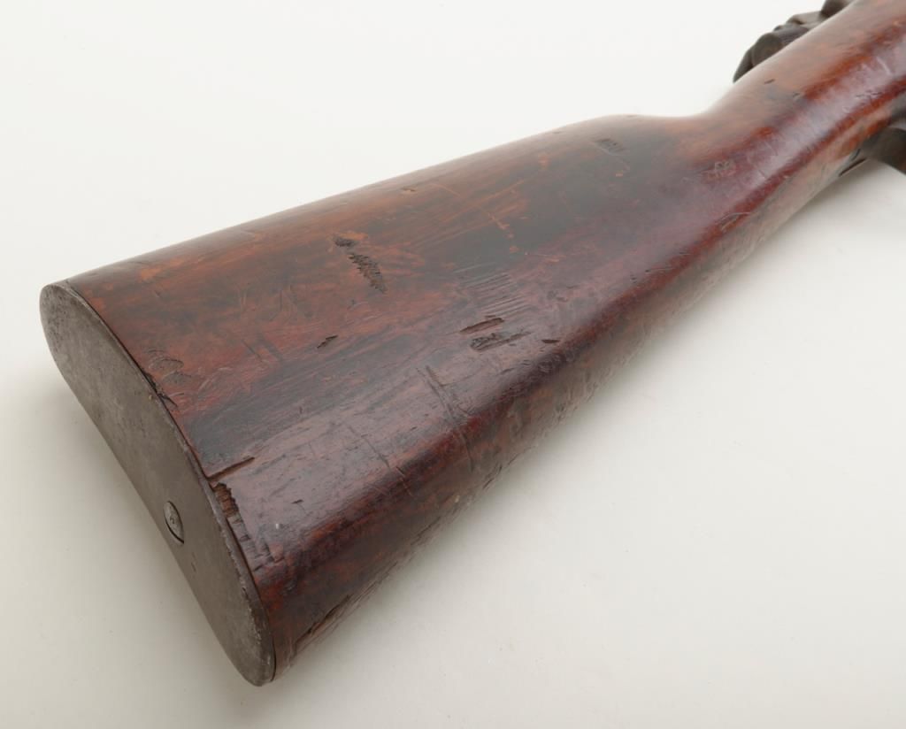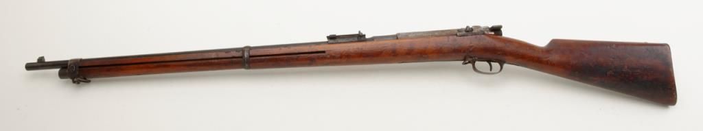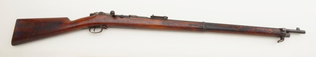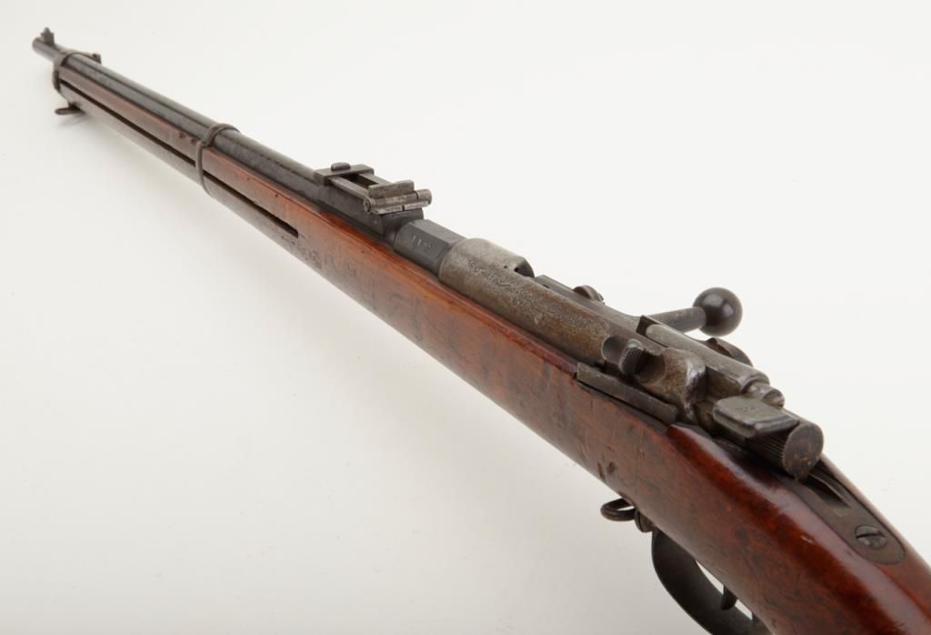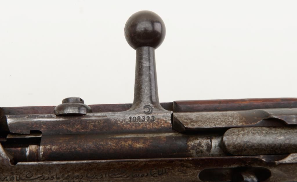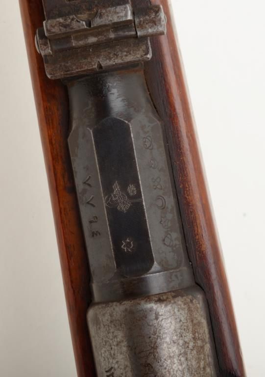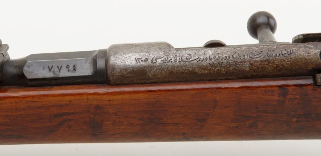 Mauser bolt action rifle with Arabic receiver and barrel address, 9mm cal., 30” barrel, blue finish, wood stock, #NVSN. This gun is in overall good un-cleaned condition showing ample blue on the barrel under years of grime and patina; good bore, action and markings; wood is also overall good; would benefit from a careful cleaning and oiling. From an old collection. (Antique). Est.: $150-$300.