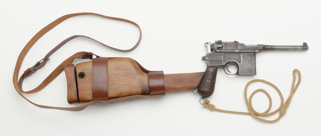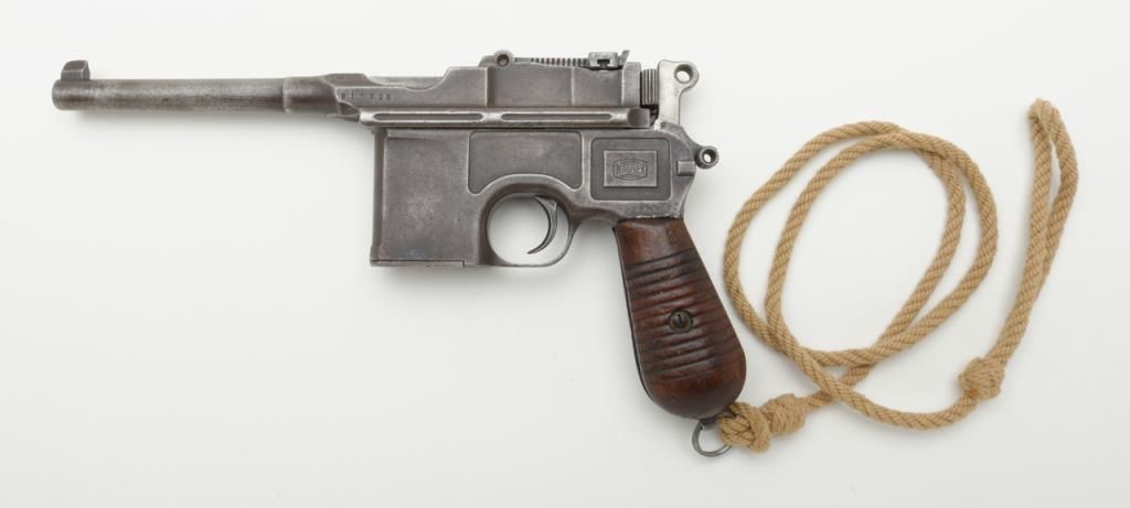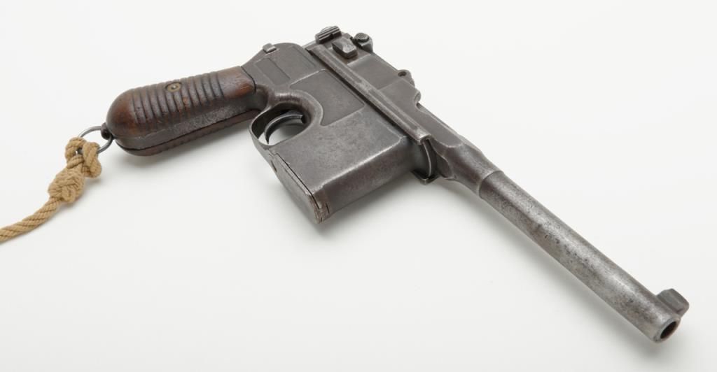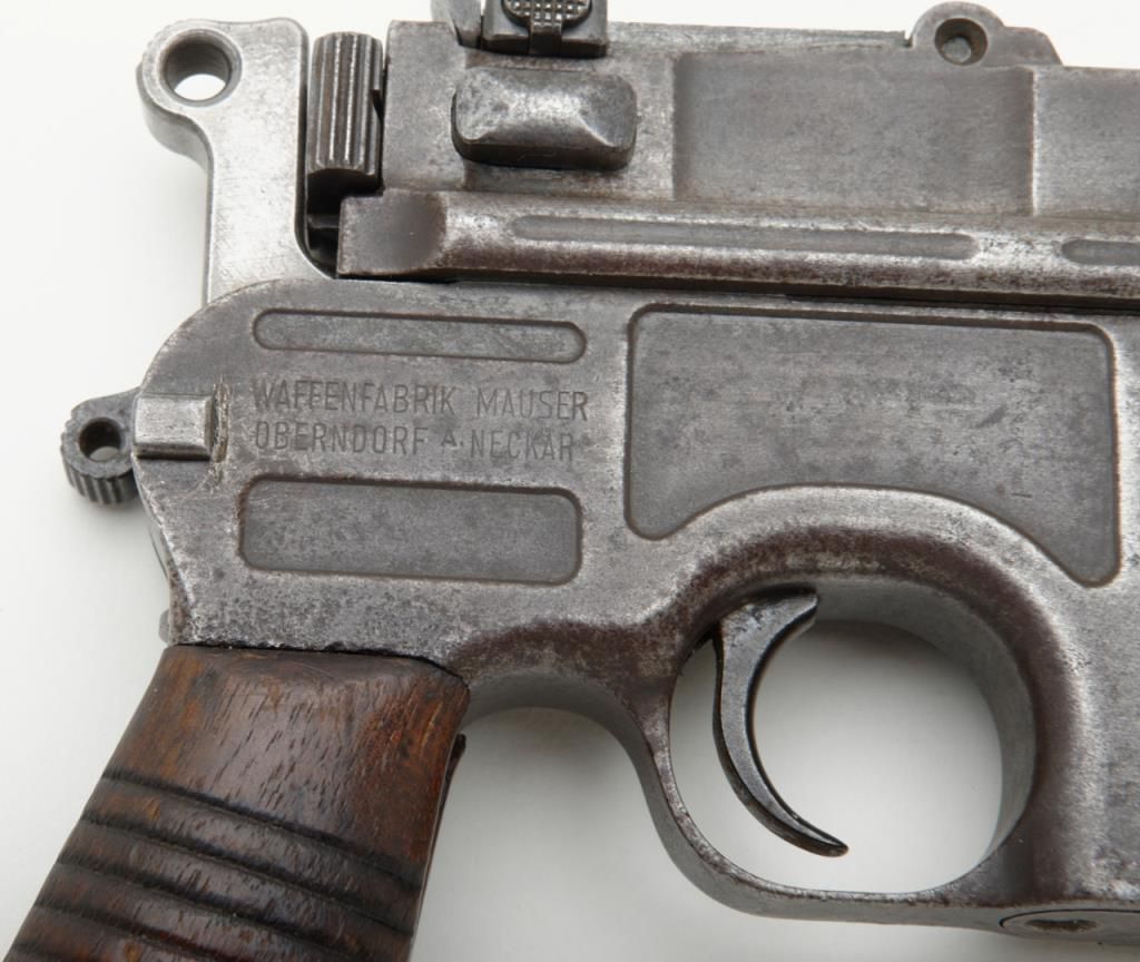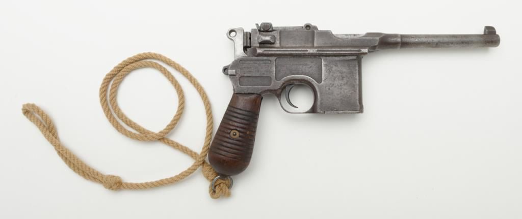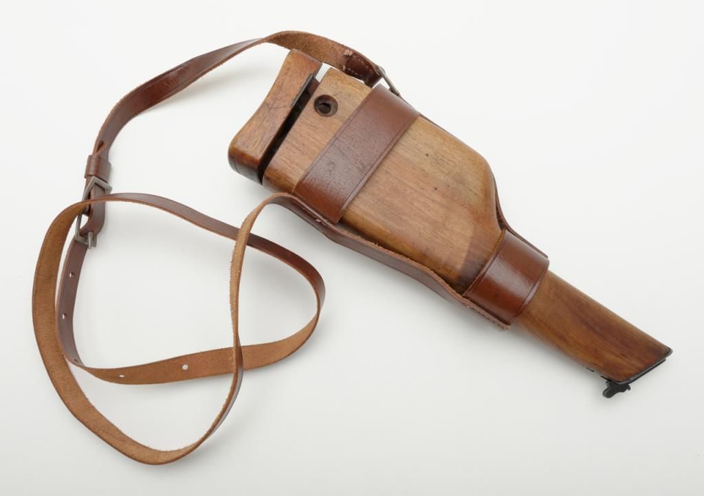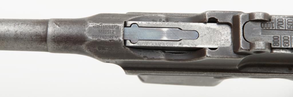 Mauser broom handle Luger in .30 caliber with stepped barrel and Mauser banner along with wooden stock holster, serial number 813820. The Mauser shows traces of original blue gone to brown with scattered light to moderate pitting and erosion. The grips are good and generally good overall. The bore is fair and somewhat dark but may clean. An original shoulder stock is included which is missing its latch and has been sanded also the metal has been restored or replaced. No imports marks. Est.: $400-$800