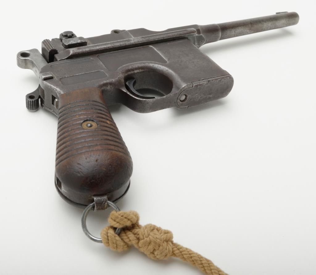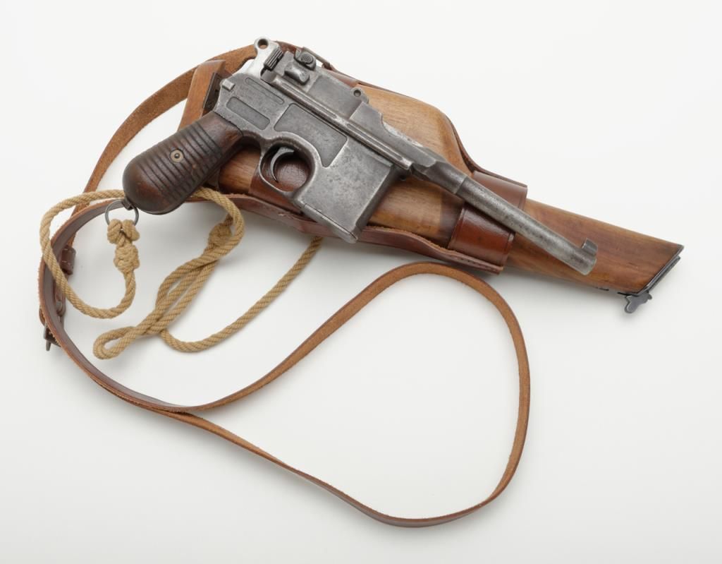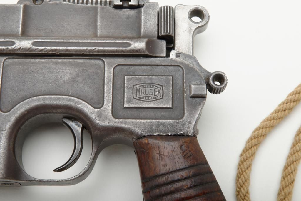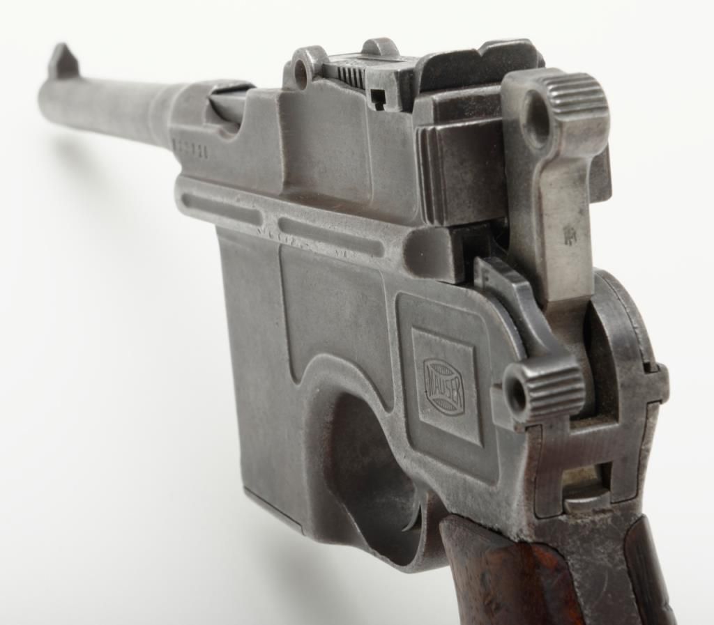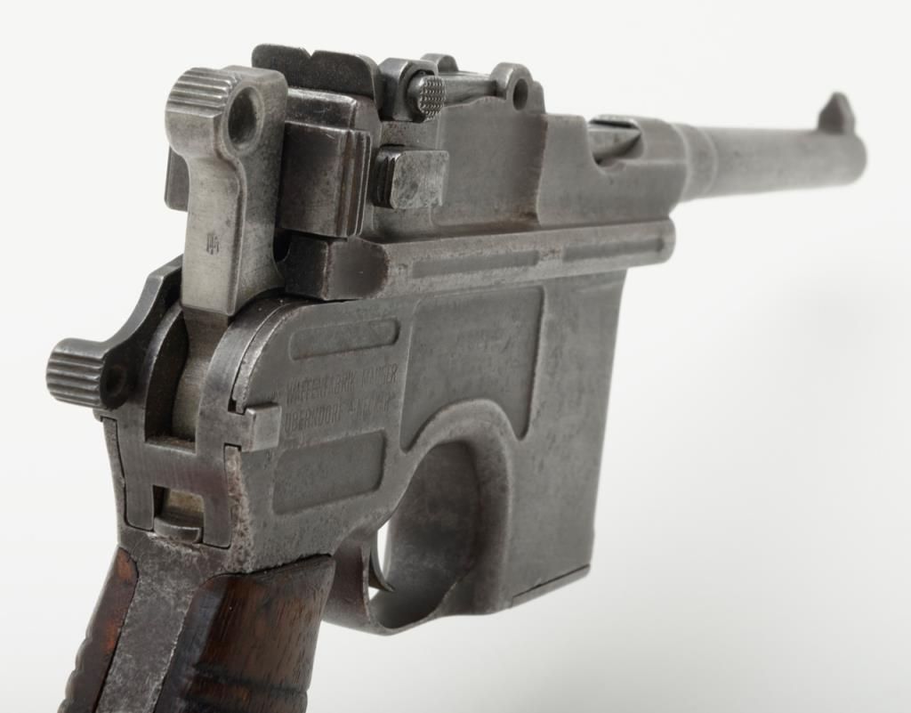 Mauser broom handle Luger in .30 caliber with stepped barrel and Mauser banner along with wooden stock holster, serial number 813820. The Mauser shows traces of original blue gone to brown with scattered light to moderate pitting and erosion. The grips are good and generally good overall. The bore is fair and somewhat dark but may clean. An original shoulder stock is included which is missing its latch and has been sanded also the metal has been restored or replaced. No imports marks. Est.: $400-$800