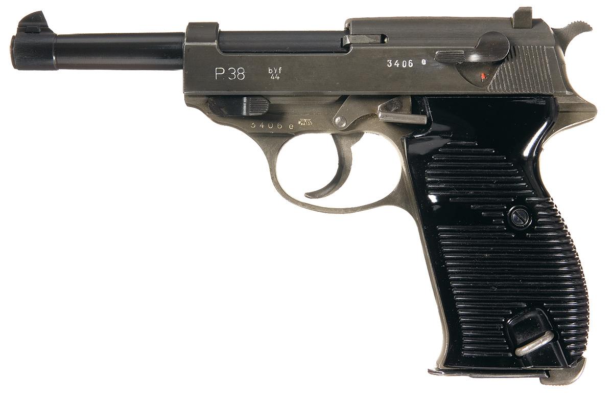 Blade and notch sights, with "P.38", "byf/ 44" and the serial number on the left side of the slide, and "WaA135" and "eagle/ swastika" proofs on the right side, which are repeated on the barrel, locking block and frame. Matching serial numbers. Ribbed black plastic grips.