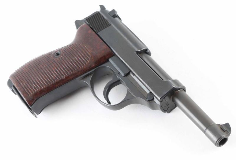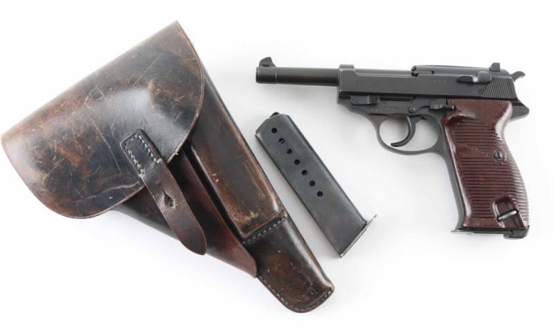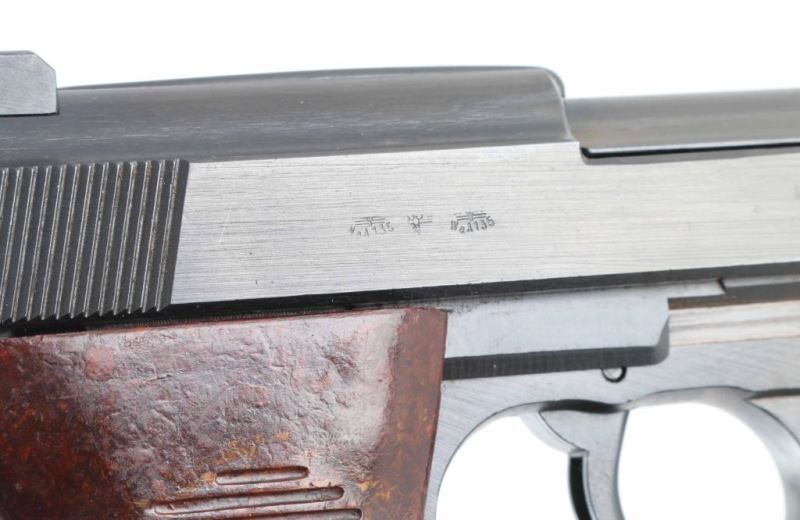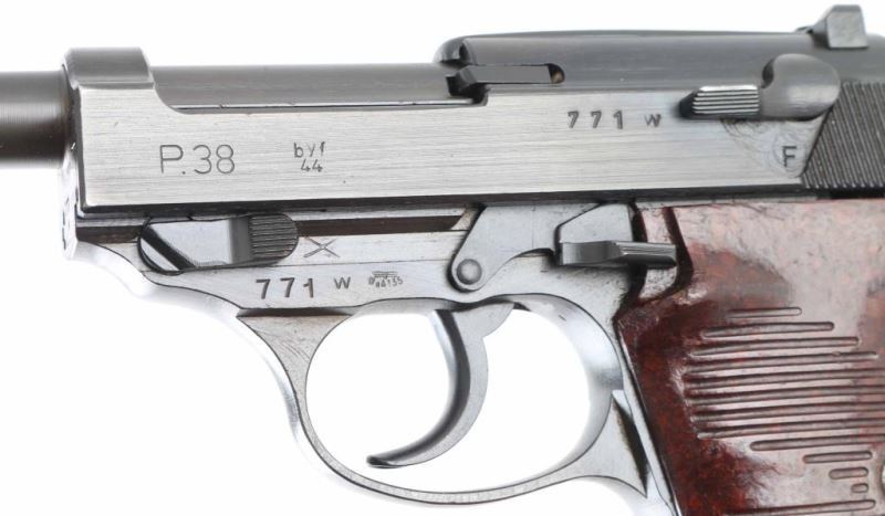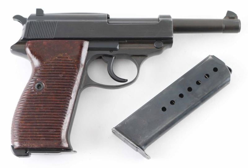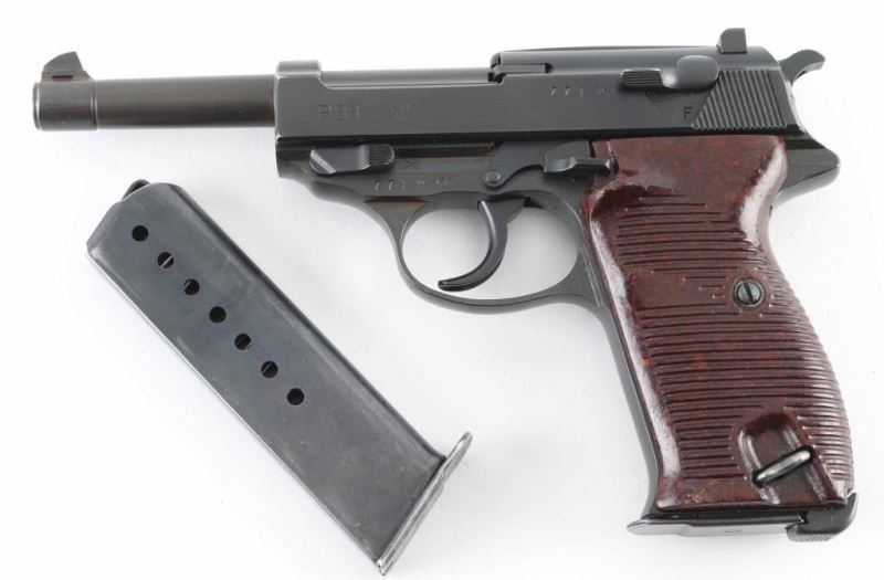German WWII military semiautomatic pistol features blued finish, reddish brown plastic grips, 4.8" barrel, fixed sights, double action trigger, slide mounted decocker/safety, heel magazine release. Bore is good to very good condition with some darkness in grooves. Retains 95% finish on metal parts, some bare metal at sharp edges. Grips are very good condition. Numbers on barrel & slide match the frame, marked "byf 44", Waffenamt, Eagle over "WaA135". Chisel marked "X" on frame left side. No import marks observed. Includes holster & (2) magazines, one marked "P.38" and "eagle over 358", reblued with some pitting on side under the refinish, another marked "P.38" with electric pencil marked "8932l". Holster is good condition, dark brown full flap, marked on back "STOLLA WIEN" & "GES-GESCH". Condition is NRA Very Good (Possible Reblue) *** C&R Firearm ***