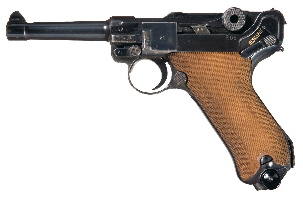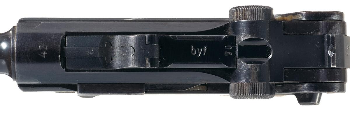 Fixed sights, with "42" date on the chamber and "byf" manufacturer code on the toggle. The barrel extension is marked with a pair of "eagle/ 135" proofs and an "eagle/ swastika" proof, which is repeated on the barrel and breechblock. Matching partial numbers on the latch, side plate, sear, safety, toggle links, extractor, trigger, hold-open, toggle pin, breechblock and firing pin. Marked "P.08" on the side, with blue small parts, checkered hardwood grips and two blued magazines with plastic bases.