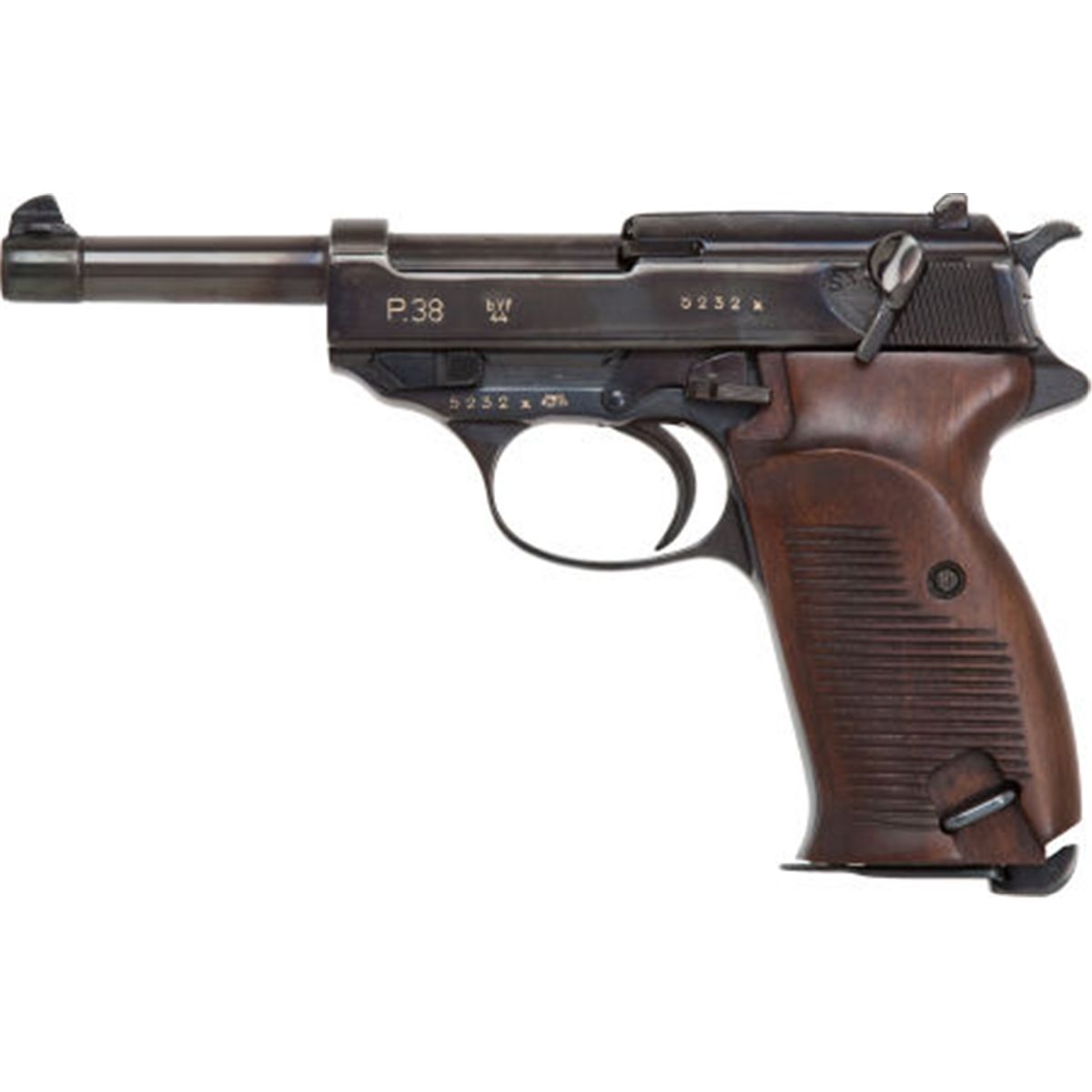 Mauser byf Code P-38 Semi-Automatic Pistol. Serial no. 5232X, 9mm, 5-inch barrel. WaA135 waffenampt. Nazi-proofed. Blued finish. Walnut aftermarket grips. Lanyard loop. Condition: Good as refinished. Retaining approximately 95-100% reblued finish with light handling wear present. Grips excellent. Action good.NRA FIREARMS FOR FREEDOM PROGRAM