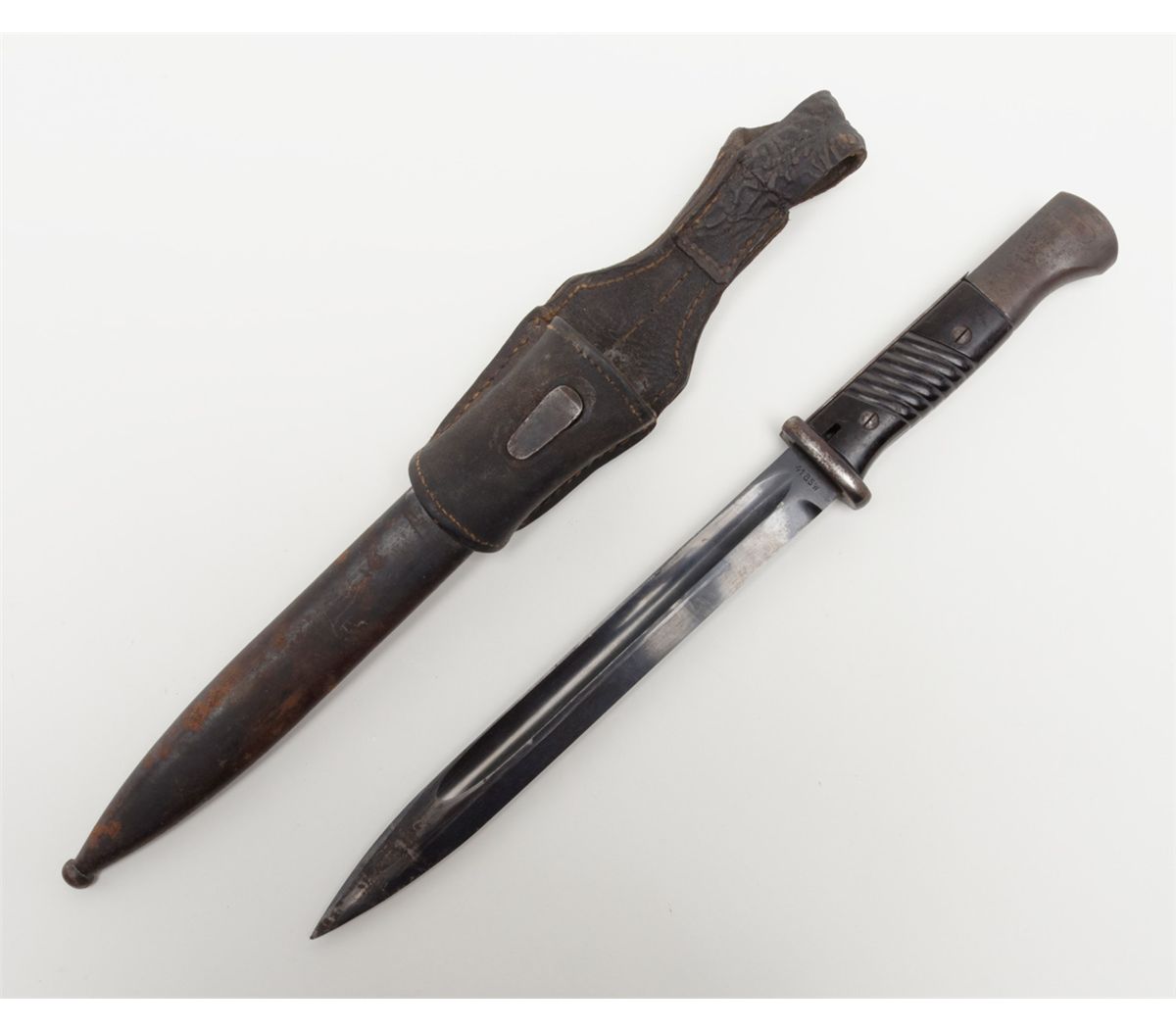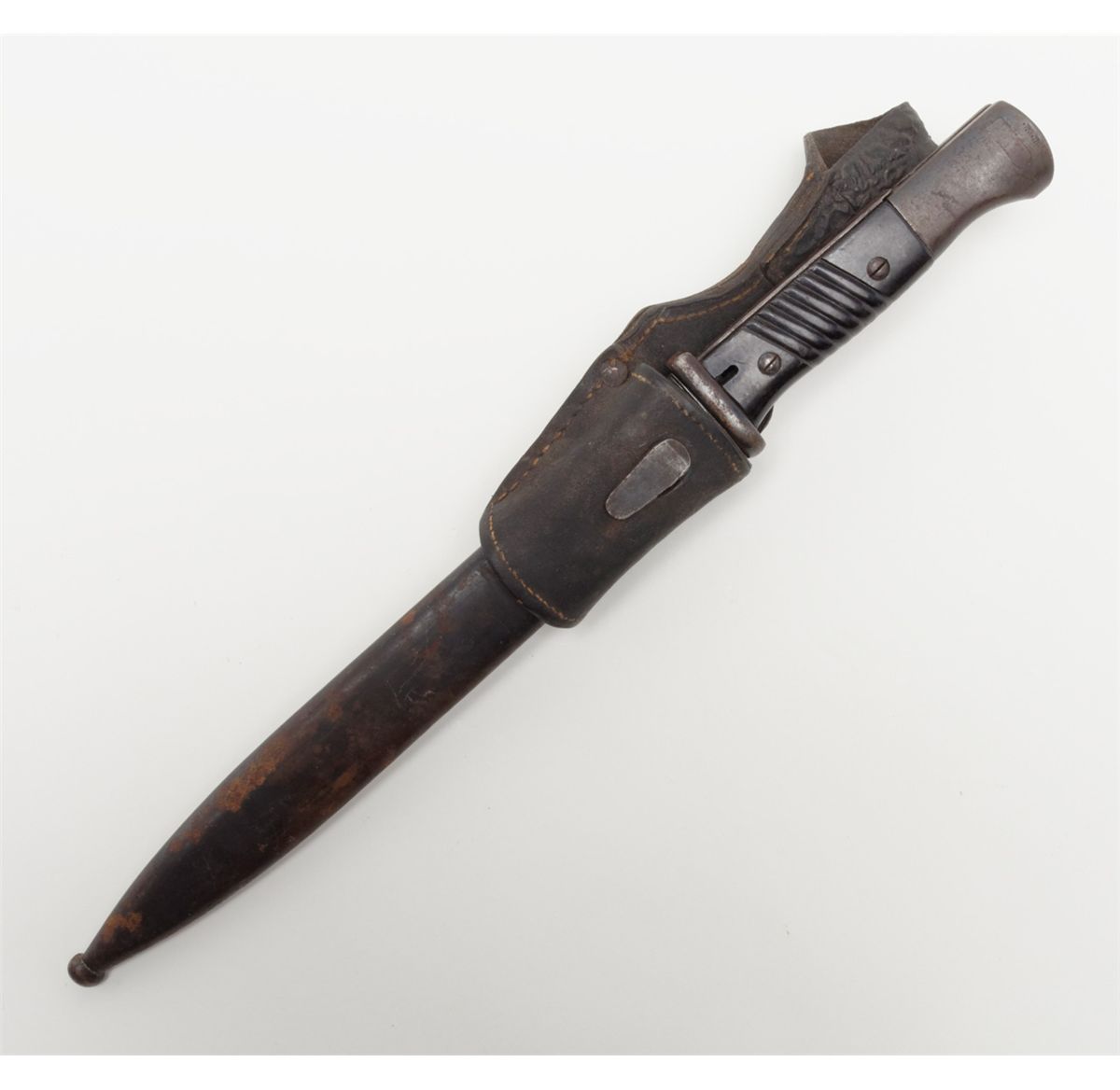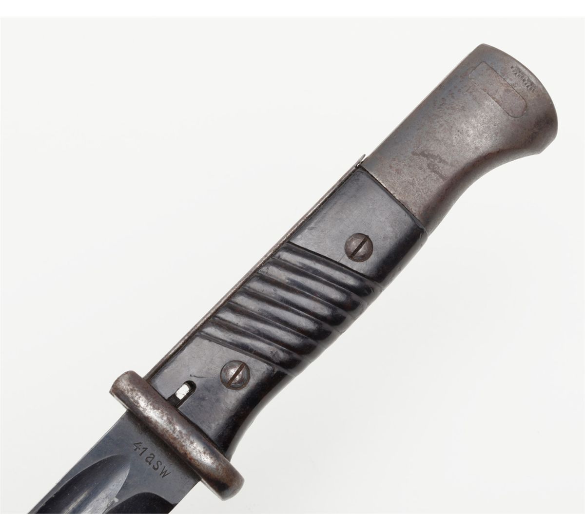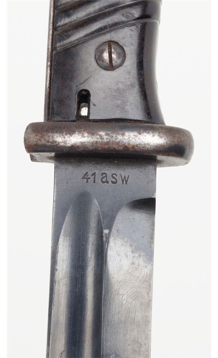 Mauser model 98 bayonet from Nazi era marked 41 ASW with scabbard and leather frog or hanger. The blade shows 80% to 90% original blue with some erosion and natural aging. The scabbard shows some areas of rust and so does the grip area but generally good overall. The leather shows some warping and natural aging and is only fair. Est.: $75-$150