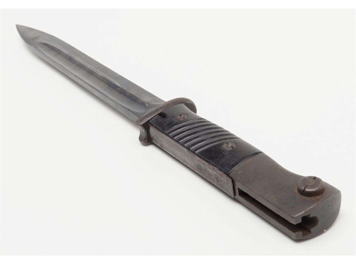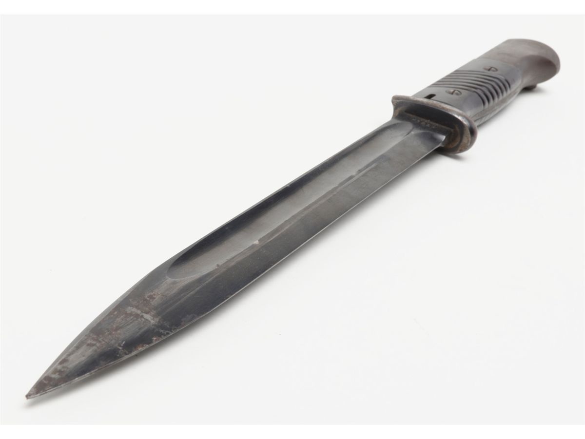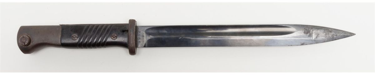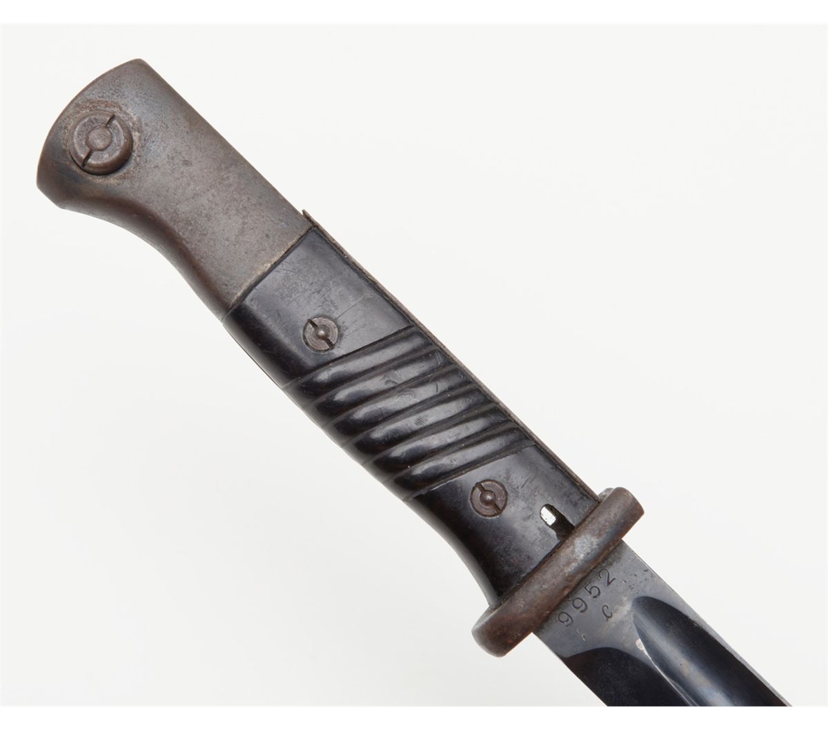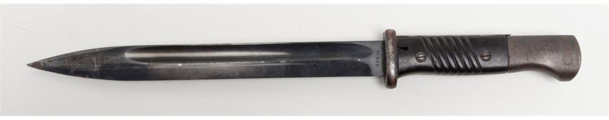 Mauser model 98 bayonet from Nazi era marked 41 ASW with scabbard and leather frog or hanger. The blade shows 80% to 90% original blue with some erosion and natural aging. The scabbard shows some areas of rust and so does the grip area but generally good overall. The leather shows some warping and natural aging and is only fair. Est.: $75-$150