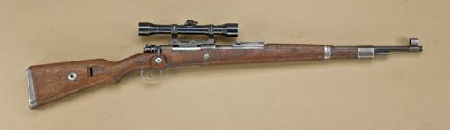 Mauser model 98 sniper rifle, 8mm caliber, manufactured by J. P. Sauer & Son, showing long-rail mounted scope with quick lever release. Serial #6458, dated 1943 on breech. Scope marked “Dialythan 4 Power” by BMJ Code, serial #75001, mount #814B. With 359 Nazi eagle proof. The gun remains in good to very good original condition showing 30-50% original blue evenly thinning and toning. The stock is also good with many small dings and mars consistent with military service and use. Good traces of inspection marks and large initial “H” on cheek piece of right butt. The barrel and action show punch-dots for special assembly or treatment. The action is good, the bore is very good. Refer: The German Sniper: 1914-1945 pages 245-268. The bolt is numbered 4352, all other external numbers 6458. In this cataloger’s experience, German sniper rifles were generally notmatched if issued as the snipers changed bolts and parts constantly and often had several different fitted bolts for each rifle because of weather conditions. The snipers had access to individual armorers who would