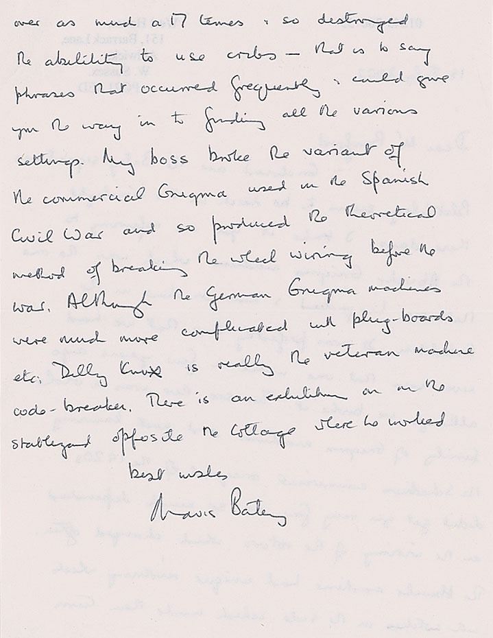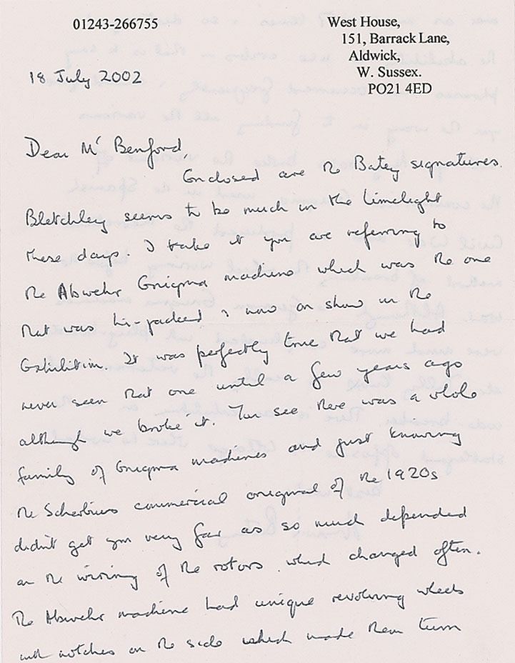 ALS, one page both sides, 5.25 x 7, personal letterhead, July 18, 2002. Letter discussing codebreaking and the Enigma machines used by the Axis during World War II. In part: "Bletchley seems to be much in the limelight these days. I take it you are referring to the Abwehr Enigma machines which was the one that was hi-jacked & not on show in the exhibition. It was perfectly true that we had never seen that one until a few years ago although we broke it. You see there was a whole family of Enigma machines and just knowing the Scherbius commercial original of the 1920s didn't get you very far as so much depended on the wiring of the rotors, which changed often. The Abwehr machine had unique revolving wheels with switches on the side which made them turn…so destroyed the ability to use cribs—that is to say phrases that occurred frequently, could give you the way in to finding all the various settings. My boss broke the variant of the commercial Enigma used in the Spanish civil war and so produced the theoretical method of breaking the wheel wiring before the war. Although the German Enigma machines were much more complicated with plug-boards etc." In fine condition.
