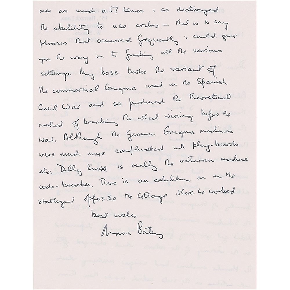 ALS, one page both sides, 5.25 x 7, personal letterhead, July 18, 2002. Letter discussing codebreaking and the Enigma machines used by the Axis during World War II. In part: "Bletchley seems to be much in the limelight these days. I take it you are referring to the Abwehr Enigma machines which was the one that was hi-jacked & not on show in the exhibition. It was perfectly true that we had never seen that one until a few years ago although we broke it. You see there was a whole family of Enigma machines and just knowing the Scherbius commercial original of the 1920s didn't get you very far as so much depended on the wiring of the rotors, which changed often. The Abwehr machine had unique revolving wheels with switches on the side which made them turn…so destroyed the ability to use cribs—that is to say phrases that occurred frequently, could give you the way in to finding all the various settings. My boss broke the variant of the commercial Enigma used in the Spanish civil war and so produced the theoretical method of breaking the wheel wiring before the war. Although the German Enigma machines were much more complicated with plug-boards etc." In fine condition.