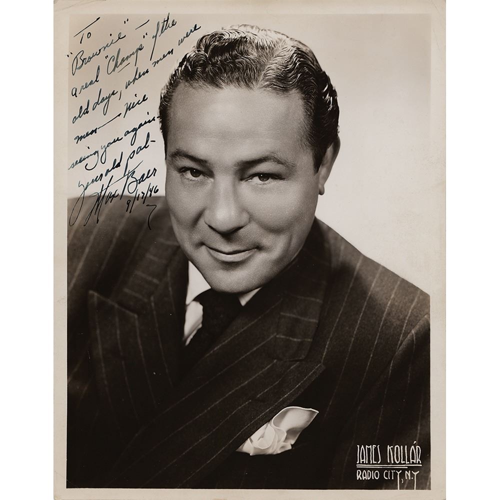 Vintage glossy 8 x 10.25 James Kollar studio photo of the former heavyweight boxing champ in a handsome pinstripe suit, signed and inscribed in fountain pen, "To 'Brownie'—a real 'Champ' of the old days, when men were men—nice seeing you again, Your old pal, Max Baer, 9/17/46.” In very good to fine condition, with scattered light creasing.