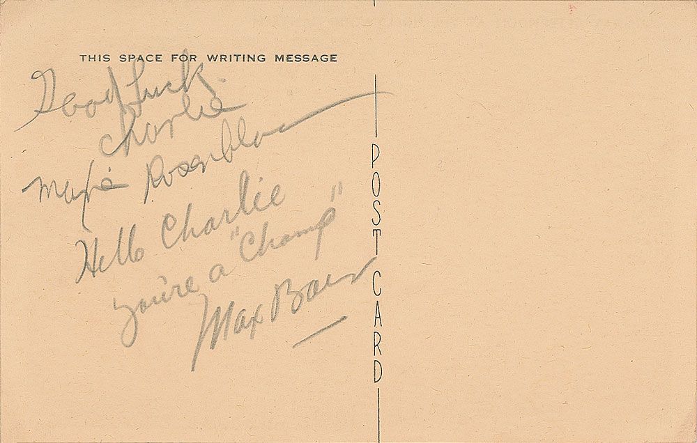 Vintage Hollywood Canteen postcard, 5.25 x 3.5, signed and inscribed on the reverse in pencil, “Hello Charlie, you’re a ‘champ’ Max Baer,” and “Good luck Charlie, Maxie Rosenbloom.” In fine condition.