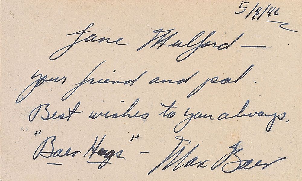 Vintage fountain pen signature and inscription, “5/4/46, Jane Mulford—your friend and pal, best wishes to you always, ‘Baer Hugs’—Max Baer,” on an off-white 5 x 3 card. In fine condition, with mild overall toning.