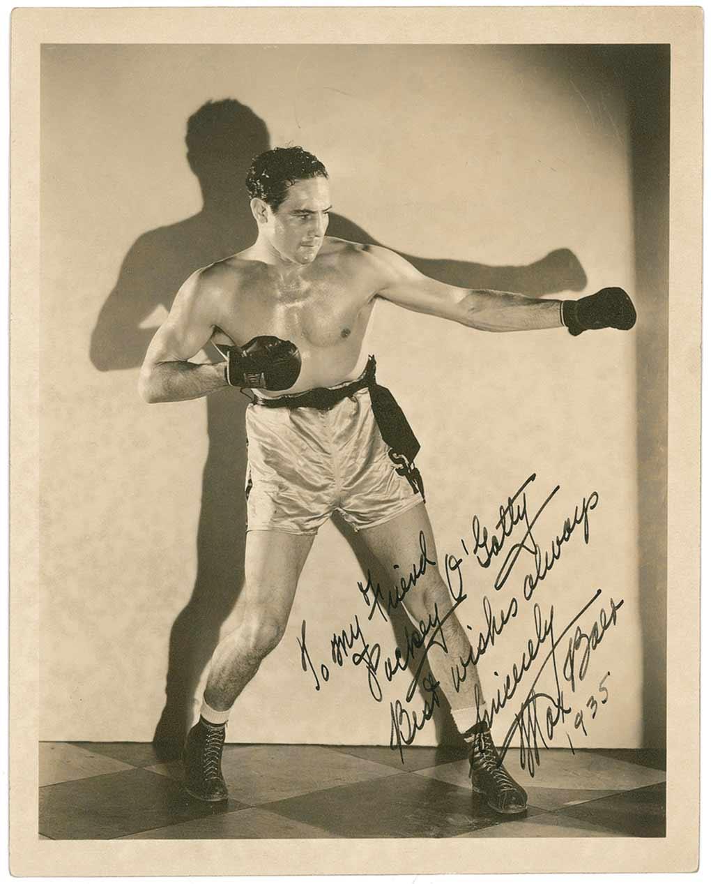 Vintage matte-finish 8 x 10 photo of Baer in his prime, signed and inscribed in fountain pen “To my friend Packey O’Gatty, Best wishes always, Sincerely, Max Baer 1935.” In fine condition, with a couple mild creases to top edge.
