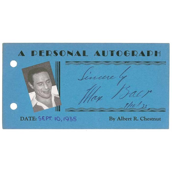 Heavyweight boxing champion of the world, 1934-1935. Vintage fountain pen signature, “Sincerely, Max Baer, 9/10/35,” on a 5.5 x 2.75 blue card from the Albert R. Chestnut collection. In fine condition, with a small photo attached to the left blank area. From his Pennsylvania home, Chestnut, a printer by profession, began collecting autographs in 1935. He sent these personally-printed cards to over a thousand celebrities and received favorable replies from the vast majority, finally retiring from collecting to raise his family when postage increased from 2¢ per card! Pre-certified Steve Grad/PSA/DNA and RRAuction COA.