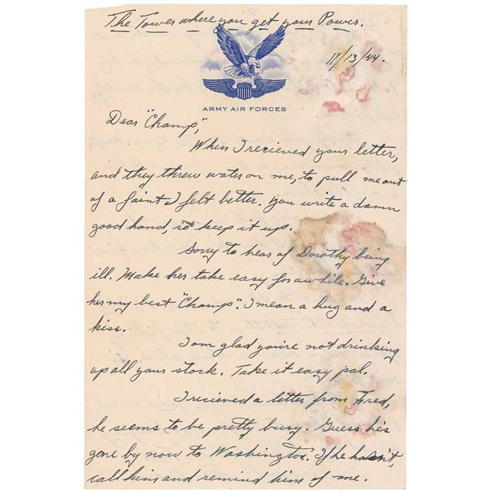 A very interesting post-fight career collection of 20 ALSs from Baer, ranging in date from 1944 up to October of 1959, a little more than a month before his death in Hollywood, California, with 19 of the letters ranging from 1954 to 1959. All letters are written to bar owner Meyer Shapiro, owner of Cunningham’s in Denver, Colorado, whom Baer had a decades-long relationship with, and would appear to be Baer’s financial savior towards the end of his life. Seventeen of the letters are accompanied by their original mailing envelopes, most signed in the return address area by Baer. Baer writes about his Hollywood career, including his movies The Harder They Fall and Utah Blaine, and mentions prominent fighters and entertainers including John L. Sullivan, Rocky Marciano, Joe Louis, Perry Como, and Rory Calhoun.