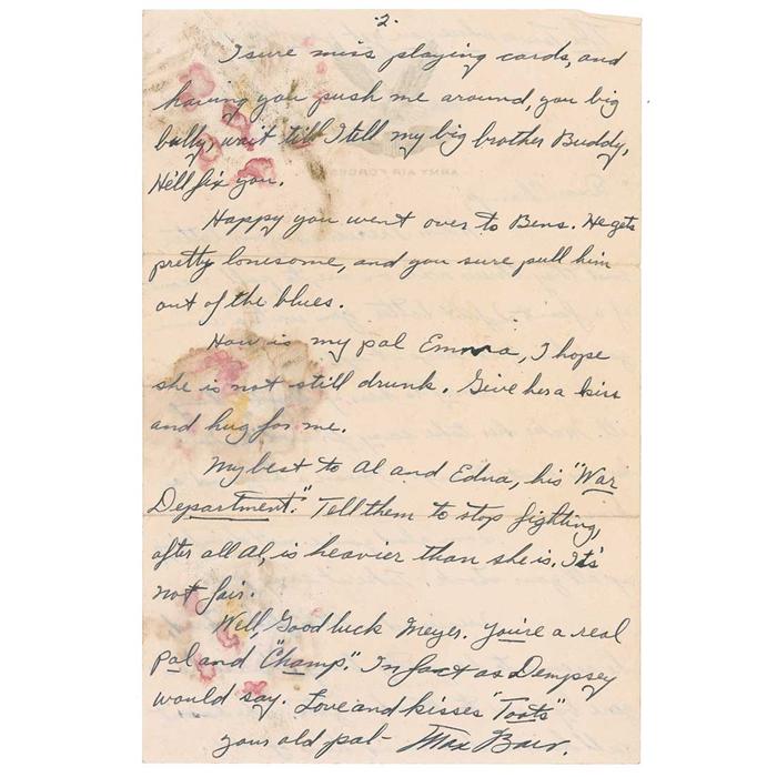 Another interesting facet of this collection, is the different variations of Baer’s signature, although all letters are signed “Max” or “Max Baer,” he also adds creative nicknames to some of the signatures, including “Uppercuts to you you Pansy,” “Max ‘The Kid?’ Baer,” “Bartender Max Baer,” “The Doorman and Bouncer at ‘Cunningham’s Clip Joint,’” “Your bouncer when I’m in Denver,” and very appropriately “Your indebted pal.”