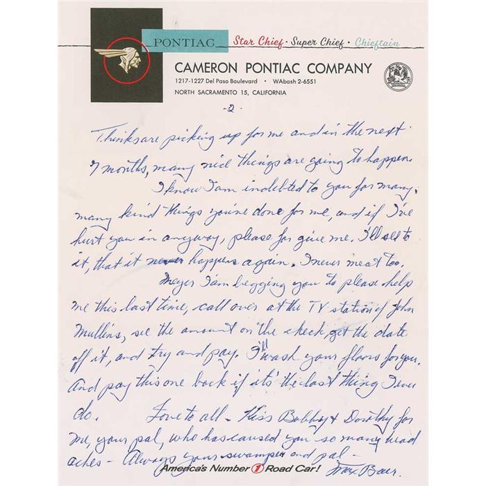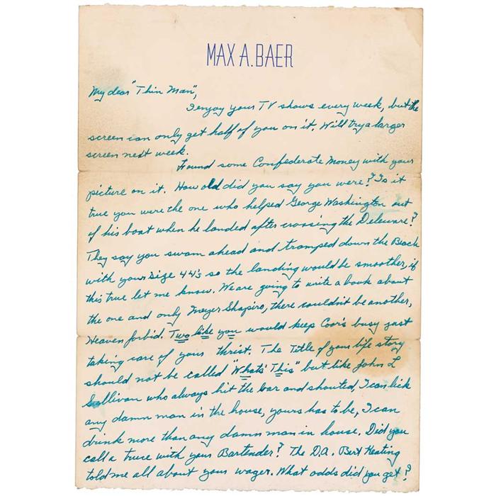In another letter, dated July 21, 1958, Baer writes of his upcoming pay days, promising to settle his debt with Shapiro as soon as he can. “I shall take care of it as soon as things get going. Which will be soon … I go to Las Vegas to get things arranged for my first TV show … following Oscar Levant … which will be tough as hell … Then I leave … for Chicago for Eagles convention with Buddy this is a pay day … fly to Seattle Washington for the Gold Cup Races, another pay day … Now if I can make Mary think I am getting $200 she won’t complain about me … She doesn’t know I owe you my life already. What can, or should we do Meyer. Things have been slow for me and are now starting to pick up.”