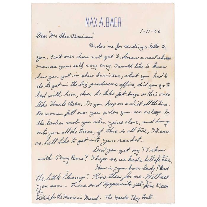 January 11, 1956: “Did you get my TV show with Perry Como? I hope so, we had a hell of a time … P.S. Watch for the movie in March: The Harder They Fall.” Baer had a cameo in this film, which incidentally was Humphrey Bogart’s last film.