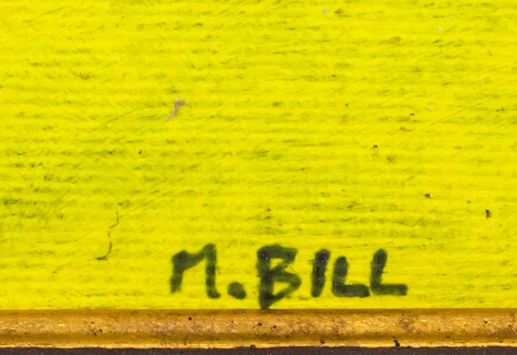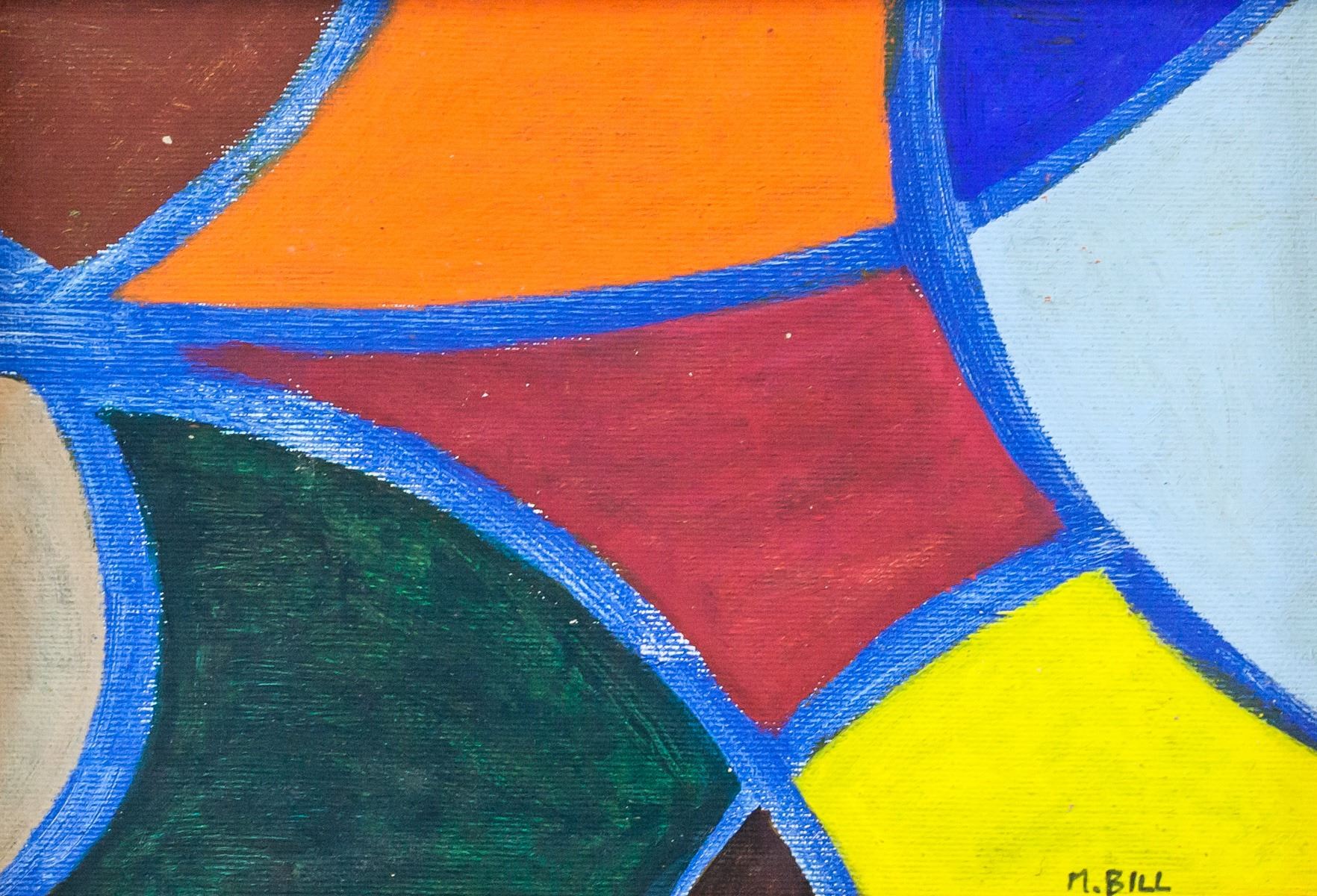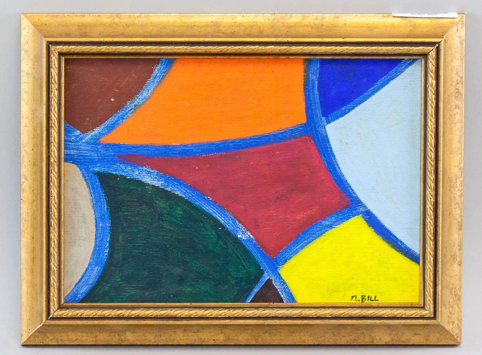 Oil on canvas, framed. Featuring geometric composition akin to De Stijl. Signed "M. BILL' in the bottom right corner. Attributed to Max Bill (1908-1994, Swiss). 30 x 21 cm (12 x 8.25 in). Provenance: This lot carries limited provenance from a Southern Ontario estate