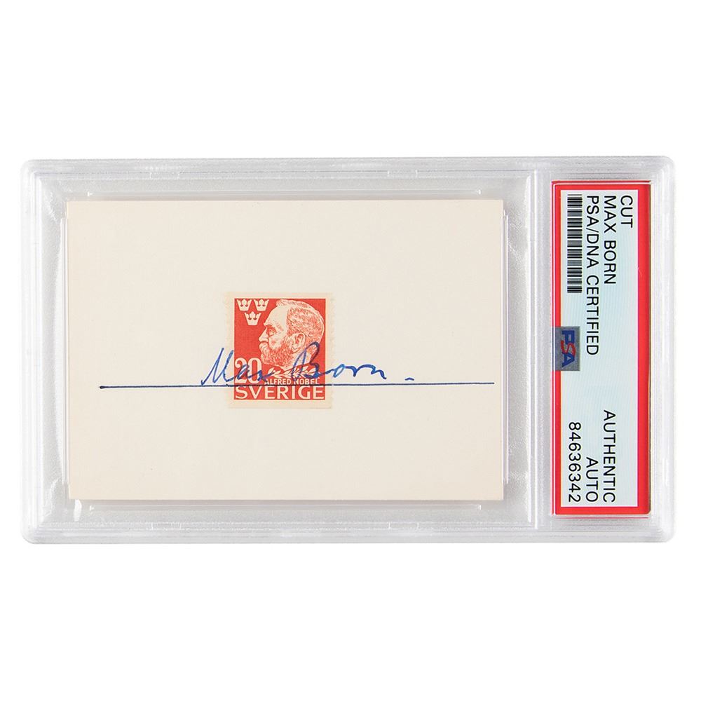 Fantastic fountain pen signature, "Max Born,†over a Swedish stamp honoring Alfred Nobel affixed to an off-white 3.5 x 2.5 card. In very fine condition. Encapsulated in a PSA/DNA authentication holder.