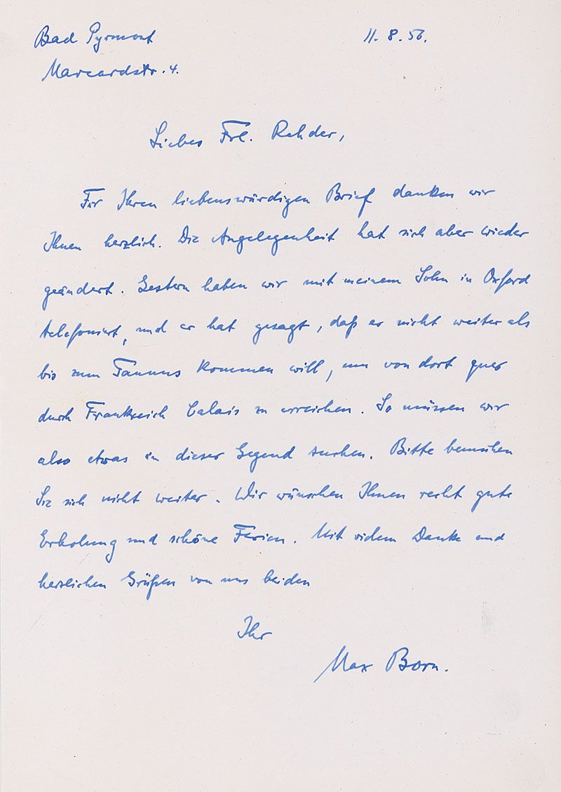 German mathematician and physicist (1882–1970) who won the 1954 Nobel Prize in Physics for his work in quantum mechanics. ALS in German, one page, 5.75 x 8.25, August 11, 1956. Letter to Otto Hahn’s secretary, Marie-Luise Rehder, in which Born thanks her for the kind letter and informs her that the travel plans of his son have changed and he won’t drive further than the Taunus area and from there to France. In fine condition. Accompanied by the original mailing envelope, addressed in Born’s own hand. Originates from Rehder’s estate.