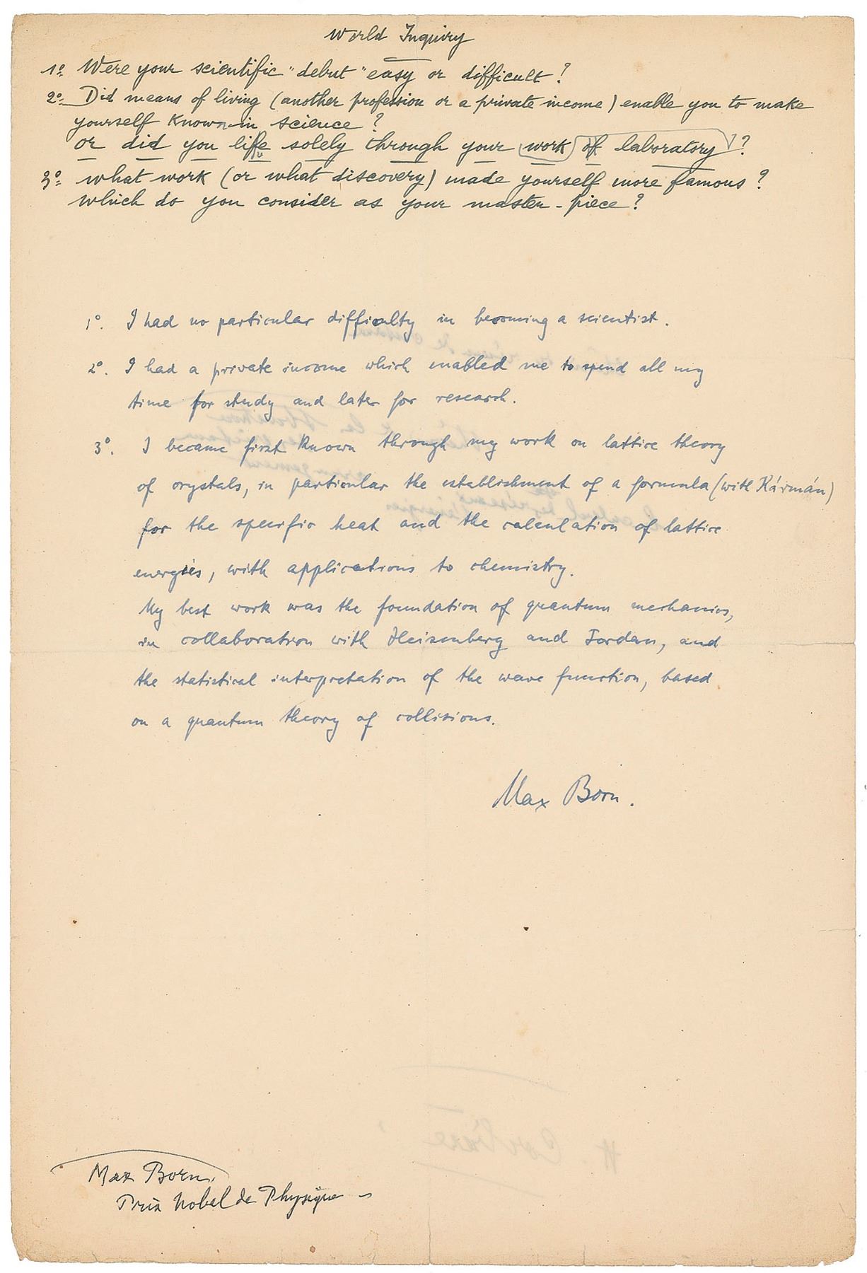 Handwritten responses by Born to a series of three biographical questions, signed "Max Born," one page, 8.25 x 12.25, no date. On his scientific debut, he writes: "I had no particular difficulty in becoming a scientist." On supporting himself, he writes: "I have a private income which enabled me to spend all my time for study and later for research." On his most famous work, he writes: "I became first known through my work on lattice theory of crystals, in particular the establishment of a formula (with Karman) for the specific heat and the calculation of lattice energies, with applications to chemistry. My best work was the formulation of quantum mechanics, in collaboration with Heisenberg and Jordan, and the statistical interpretation of the wave function, based on a quantum theory of collisions." In fine condition, with short splits along intersecting folds. A fantastic, self-reflective autobiographical piece from Born.