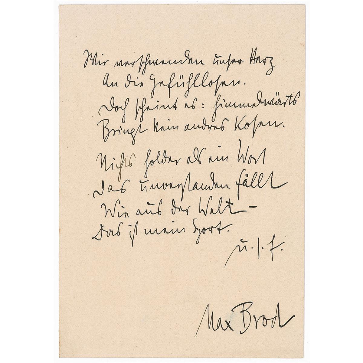 Prague-born writer and composer (1884–1968) who was an associate and confidant of Franz Kafka and mentor to Franz Werfel. Brod’s own works include the well-regarded expressionistic novel Nornepygge Castle. AQS, in German, on an off-white 4 x 6 sheet, signed at the bottom, “Max Brod.” Brod pens one stanza from one of his works, signing at the bottom. Accompanied by the original mailing envelope, addressed in Brod’s hand, and signed along the left hand side. In fine condition, with a few light wrinkles to sheet, and some scattered light creasing and toning to envelope.