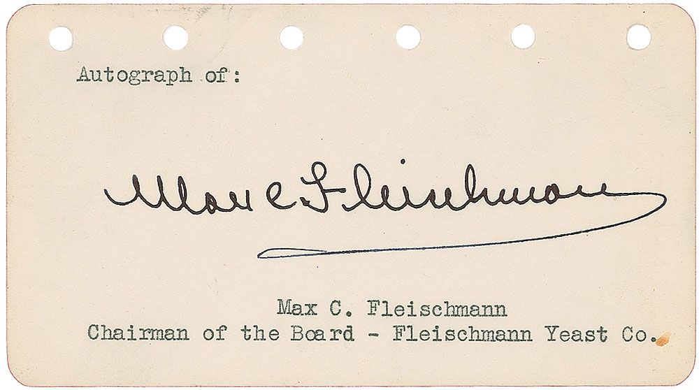 World-class balloonist, WWI veteran, and president of Fleischmann’s Yeast from 1925 to 1929. Vintage fountain pen signature, “Max C. Fleischmann,” on an off-white 4.5 x 2.5 page. In fine condition.