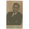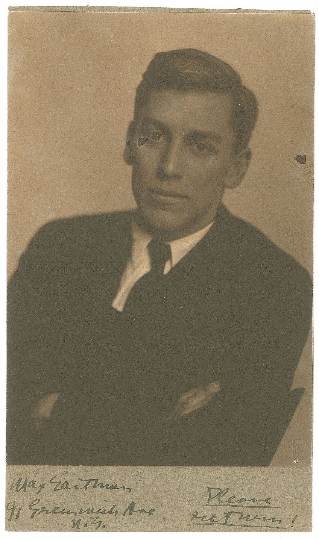 American socialist and writer (1883-1969) whose outspoken leftist leanings led him to be tried twice for sedition during World War I. He later became an ardent supporter of McCarthyism, and served as an editor for Reader's Digest. Vintage matte-finish 4.25 x 6.5 half-length photo of Eastman wearing a suit and with his arms crossed, affixed along the top edge to a slightly larger mount, signed in the lower border of the mount in fountain pen, "Max Eastman, 91 Greenwich Ave., N.Y., Please return!" In fine condition, with three small stains, one of which is beneath his right eye.