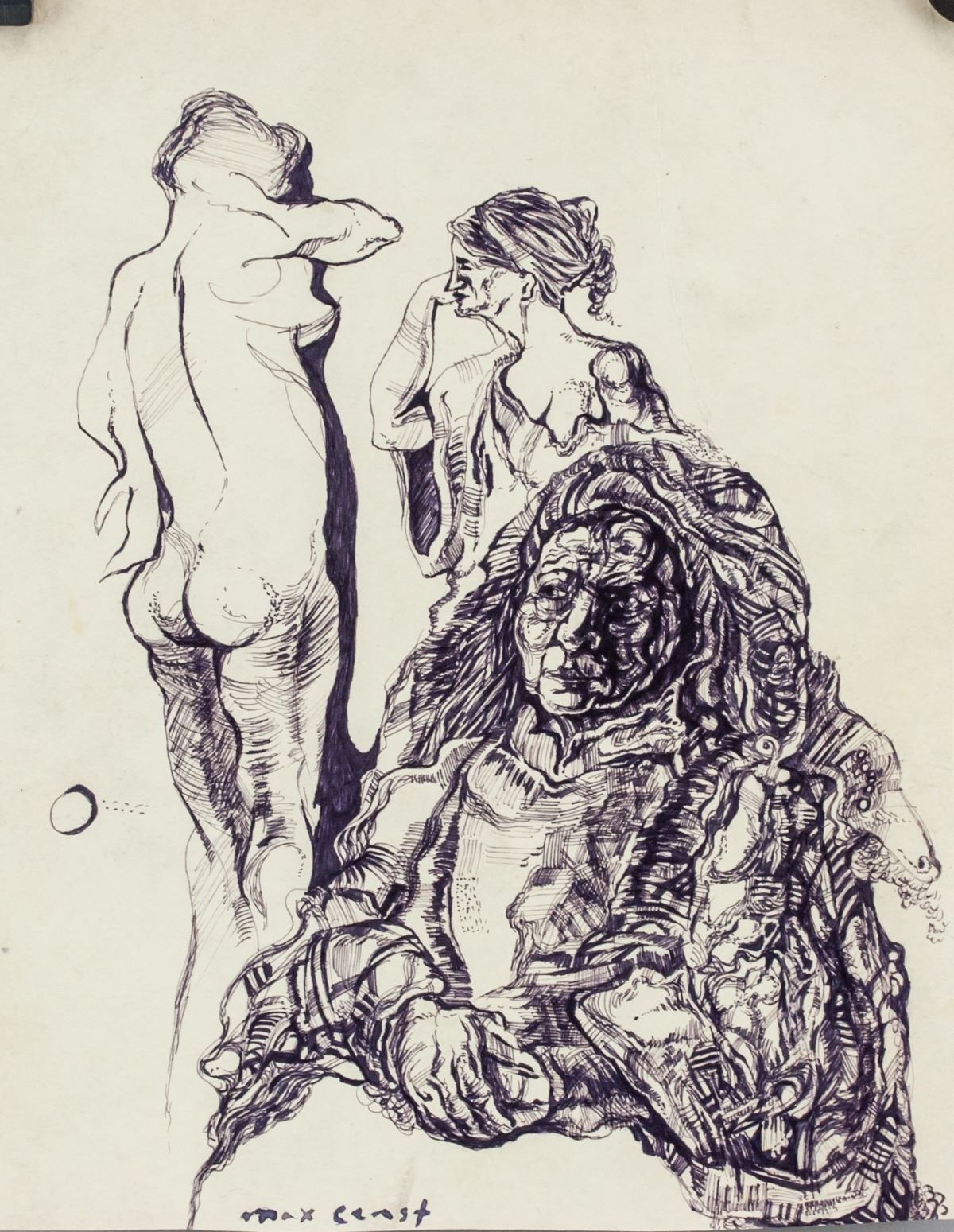 Ink on paper. Featuring sketches of three woman. Signed "Max Ernst" toward the bottom left corner. Attributed to Max Ernst (1894-1976, German). 23.5 x 29.5 cm (9.3 x 11.6 in). Provenance: This lot carries limited provenance from a Southern Ontario estate