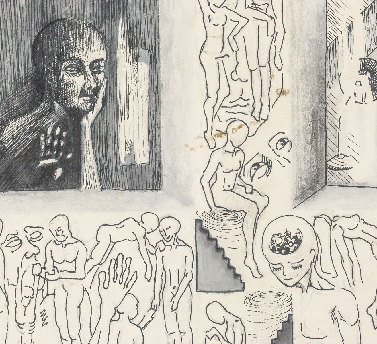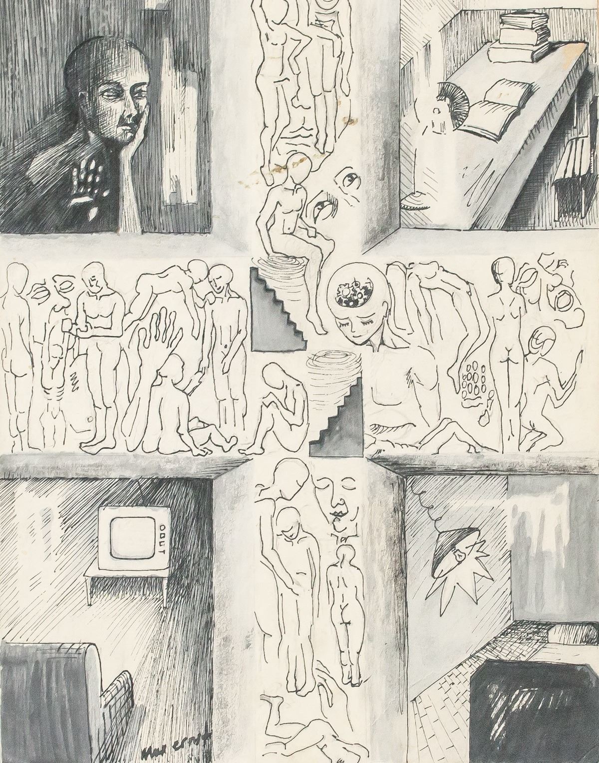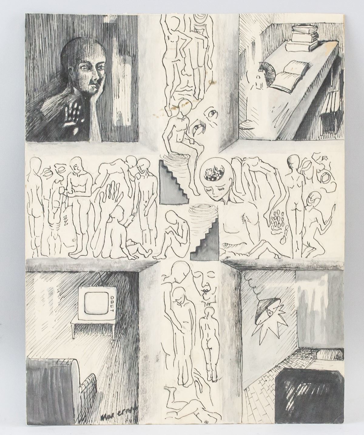 Mixed media on paper. Featuring a portrait surrealist composition showing nude figures. Signed max ernst on the lower left corner. Attributed to Max Ernst (1891-1976, German). 38 x 29 cm (15 x 11.5 inches). PROVENANCE: This lot carries limited provenance from a Southern Ontario estate