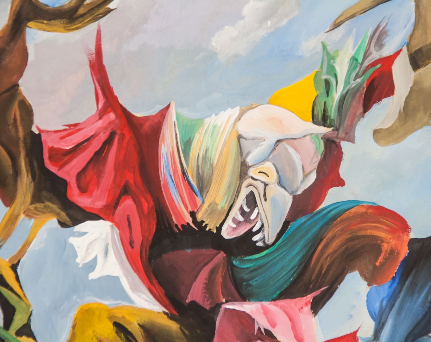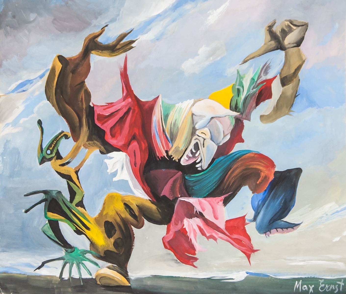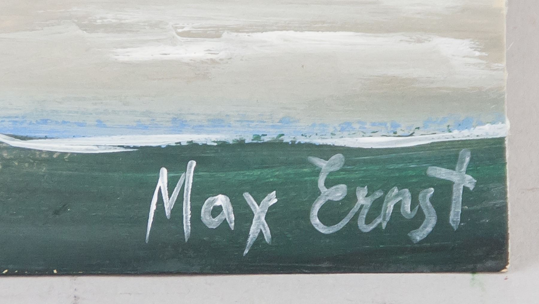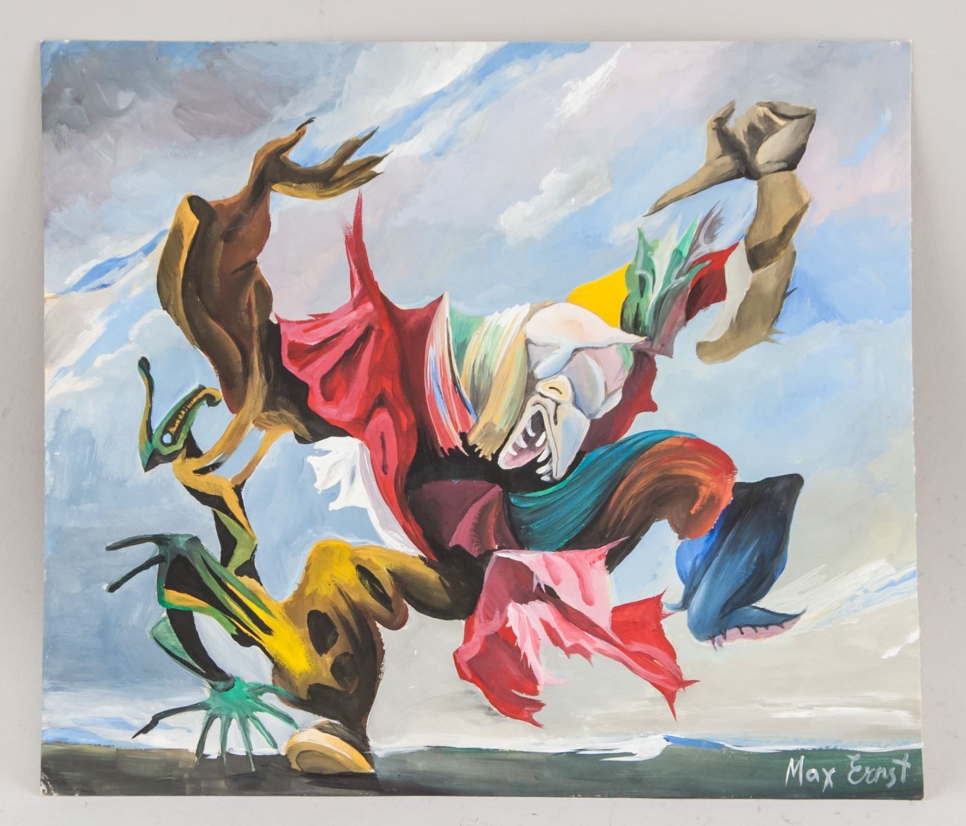Oil on paper. Featuring a surrealist portrait scene. Signed Max Ernst on the lower right corner. Attributed to Max Ernst (1891-1976, German). 21 x 24 cm (8.3 x 9.5 inches). PROVENANCE: Southern Ontario estate
