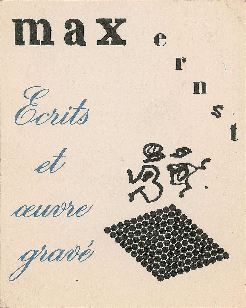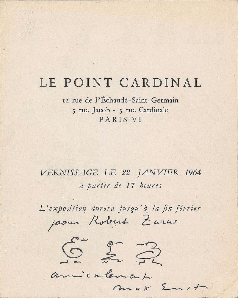 German artist (1891–1976) who was one of the principal figures of the Surrealist and Dada movements. Card for an exhibition of Ernst's works entitled "Ecrits et oeuvre grave" at Le Point Cardinal in 1964, 4.75 x 6, signed and inscribed on the reverse in ballpoint, "pour Robert Zurus, amicalement, Max Ernst," with three quick sketches above. In fine condition, with light creases to the lower right corner.