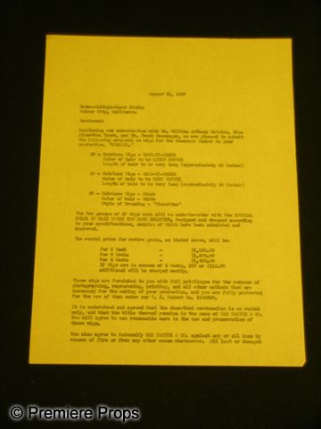 Max Factor's proposal contract for Rosalie (1937) - Features wig rental prices for 1-4 weeks and contract on yellow thin paper. Previously on display at the Hollywood Entertainment Museum.