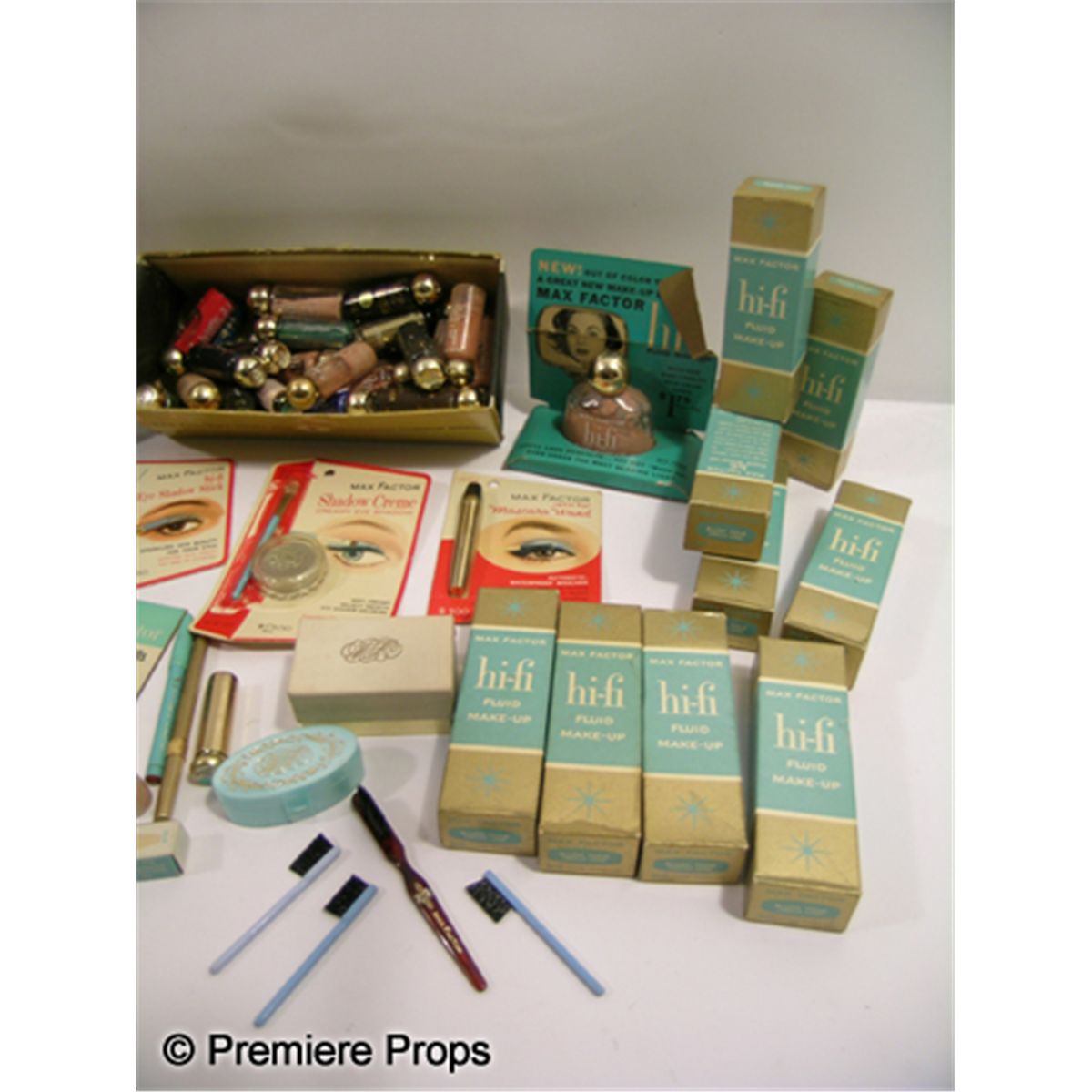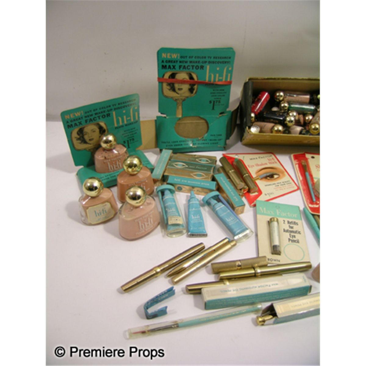 Max Factor Hi-Fi Make-Up from the 1950-1960's. Features, tube make-up, fluid make-up, outer packaging, shadow sticks, trial size bottles, eyeliners, mascara with brush, fluid rogue, lipsticks, wands, liners, brushes, and eye shadows. A large collection of vintage Max Factor make-up. Oversized item. Additional postage required. Previously on display at the Hollywood Entertainment Museum.