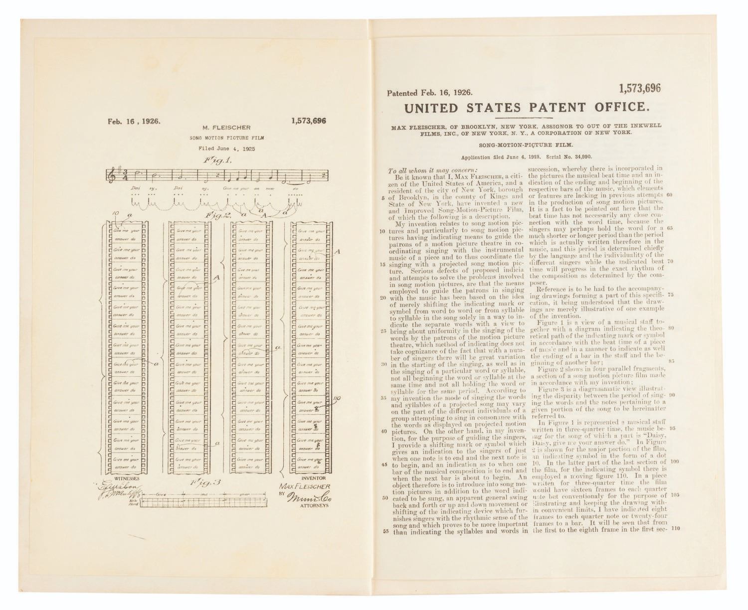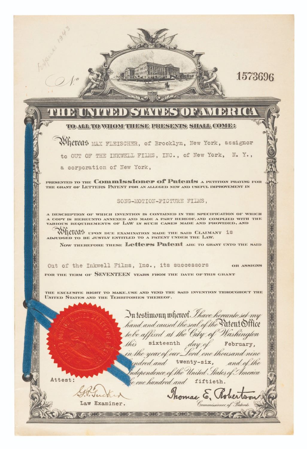 (Fleischer, 1926) Max Fleischer’s original patent certificate for inventing the bouncing ball in sing-along films. In the silent era, Fleischer brought sing-alongs into theaters by projecting glass slides with painted lyrics while the reels were being changed. To convey the timing of the lyrics to the audience, he filmed himself waving a baton with a white ball at the end to point to lyrics painted over a black background in time with the music. The bouncing ball audiences follow while singing in time with the music endures to this day, and served as the precursor to modern-day karaoke. Measuring 12” x 8” the five-page, ribbon-bound document is in good condition with light edge wear and creasing, and light discoloration from age.