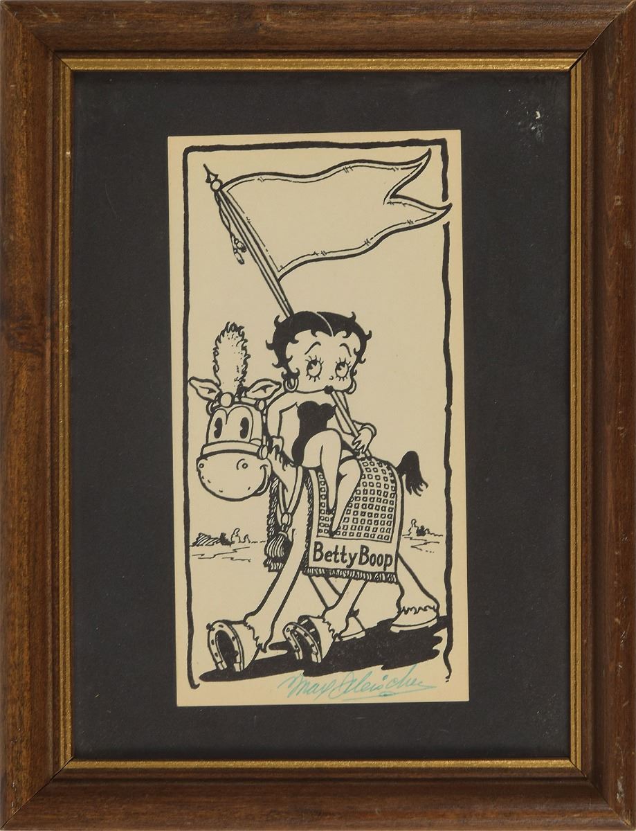 Animator (1883-1972) considered a pioneer in the development of the animated cartoon, whose Fleischer Studios brought such animated characters as Koko the Clown, Betty Boop, Popeye, and Superman to the movie screen. Green ballpoint signature, "Max Fleischer,” on an off-white 3.25 x 6.25 sheet bearing a printed illustration of Betty Boop riding a horse. Framed to an overall size of 7 x 9. In fine condition.