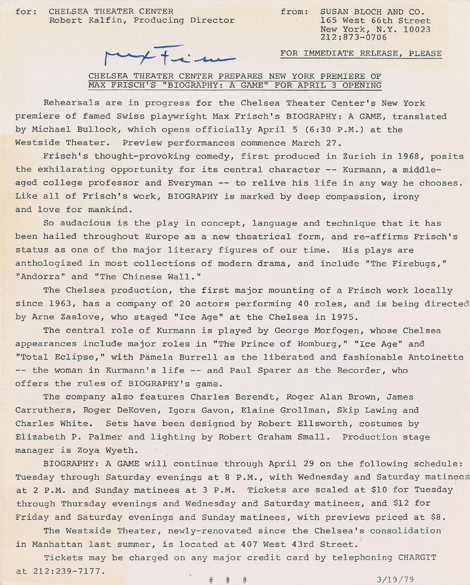 Swiss playwright and novelist (1911–1991) who was one of the founders of Gruppe Olten, and was awarded the Neustadt International Prize for Literature in 1986. Press release for the New York premiere of the play Biography: A Game at the Westside Theater on April 5, 1979, one page, 8.5 x 11, March 19, 1979, signed at the top in blue felt tip by Frisch. In part: “Frisch’s thought-provoking comedy, first produced in Zurich in 1968, posits the exhilarating opportunity for its central character—Kurmann, a middle-aged college professor and Everyman—to relive his life in any way he chooses. Like all of Frisch’s work, Biography is marked by deep compassion, irony and love for mankind.” In fine condition.