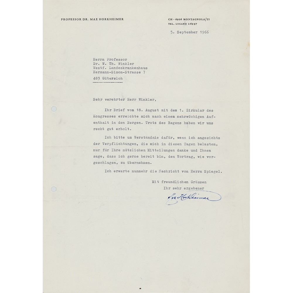 German philosopher and sociologist (1895–1973) famed for his work in critical theory as a member of the Frankfurt School. TLS in German, one page, 8.25 x 11.75, personal letterhead, September 5, 1966. Untranslated letter signed by the important philosopher. In fine condition, with some light creasing, and two file holes to the left edge.