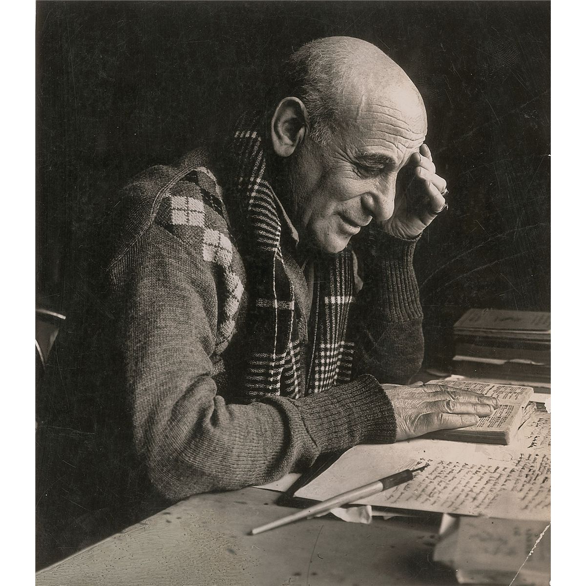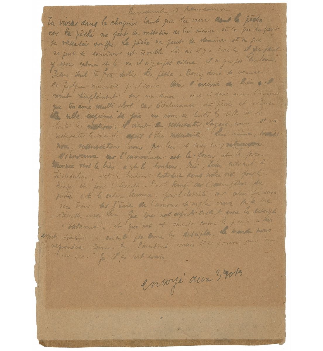 Important French poet, painter, writer, and critic (1876–1944) who converted from Judaism to Catholicism at age 39. Handwritten manuscript in French by Jacob, one page, 7 x 9.75, no date. A meditation on his love for Catholicism, entitled “Palm Sunday.” In part (translated): “You will live in sorrow as you live in sin because sin cannot get enough of himself and what cannot get enough of will suffer. Sin cannot control himself and what cannot control himself is troubled. Where there is trouble cannot be quiet and where there is no quiet there is no happiness. Jesus alone will make you get out of sin. So bless his coming in all the ways possible. Bless the coming of Jesus he only comes with love, with all the love of your soul…then the deliverance from sin will come. The city expresses the joy on behalf of all cities and all nations: he just resurrecting the area known. He will resurrect the world after having resurrected himself...Resurrect us by him and with him. Find innocence because innocence is power and strength…the good, is happiness. Yes, Jesus entering in Jerusalem, it is happiness entering our lives for time and eternity. For the time, because the exemption of sin is happiness, for eternity because the one who will receive Jesus on the simple soul of love will live eternal life with Him. That all our minds cry out loud with the disciples: 'Hosanna!' And our bones cry like stones…The world will respond like the Pharisees, but he cannot silence our joy.” In very good condition, with moderate uniform toning, scattered creases, and various small edge tears. Accompanied by a vintage unsigned glossy press photo.