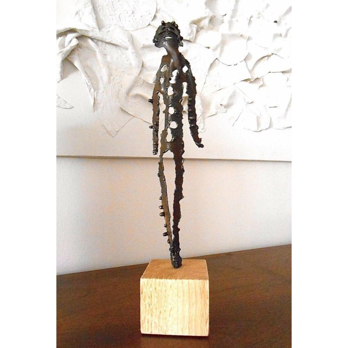 Mid Century Brutalist stylemetal sculpture by Max Kreg. Giacometti-style Abstract figure, torch cut with Brutalist welds. Various gauge steel in rustic metal pegged into a cedar wood block. Front view specific. Clear coated over weathered steel. 18†H, ( sculpture is 15†H,block is 3†H ).