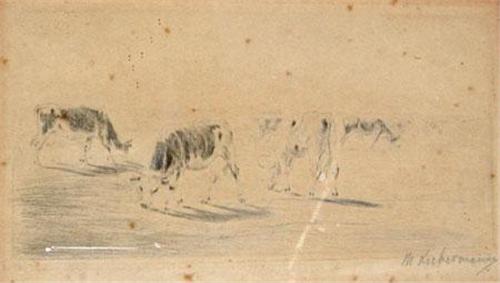 Max Liebermann, 1847 - 1935, Cows, Etching, 12x22 cm, Signed., , , , Painting in a bad condition.,