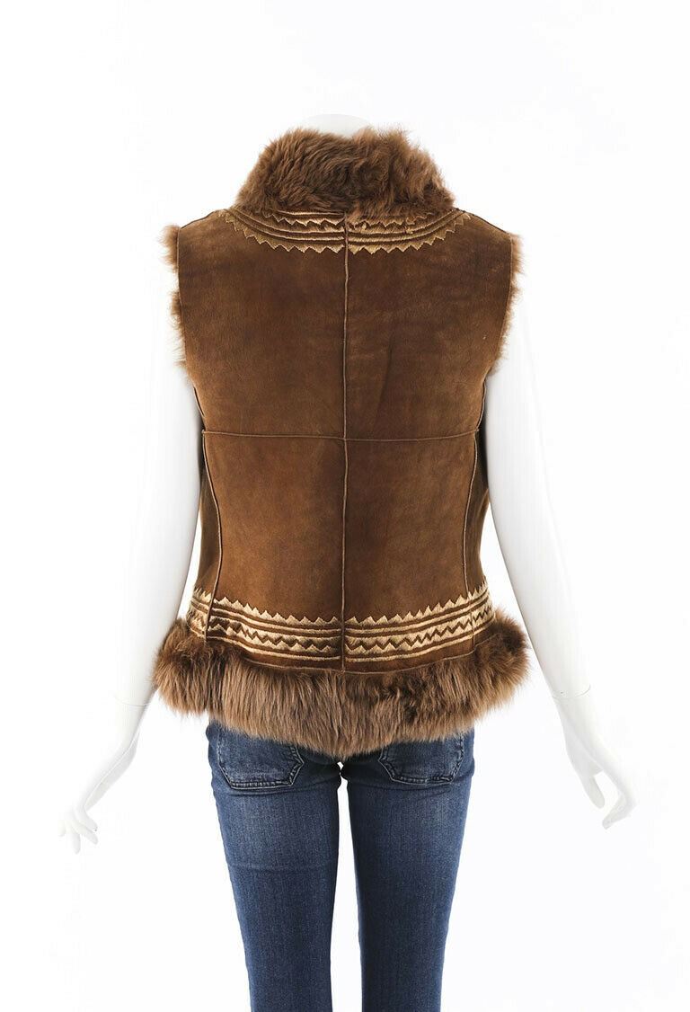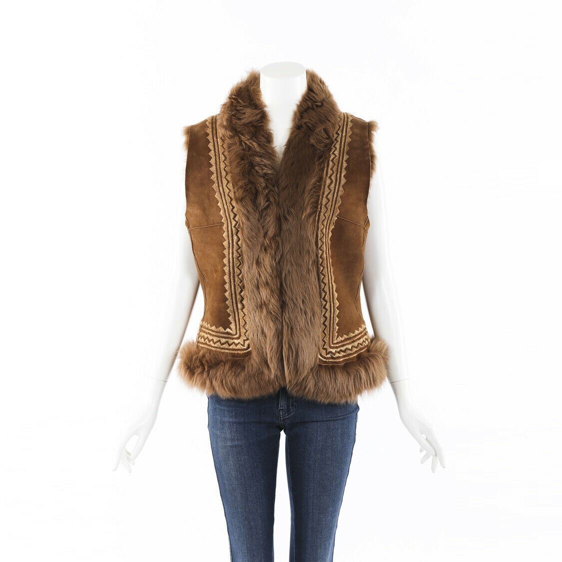 Max Mara shearling vest features gold geometric embroidery and hook and eye closures.