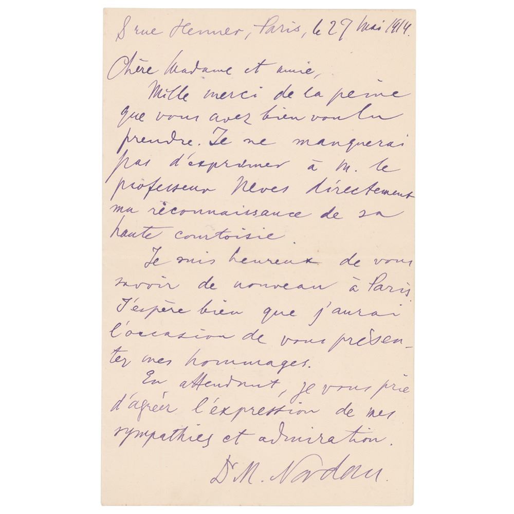 Untranslated ALS in French, signed “Dr. M. Nordau,†one page, 4.25 x 7, May 27, 1914. In fine condition.