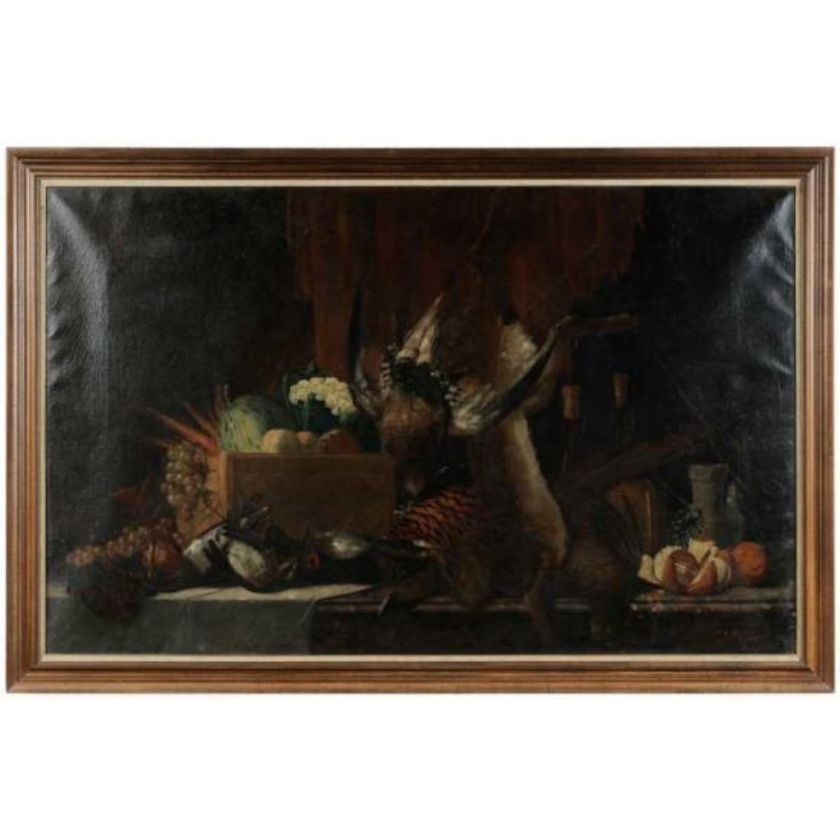 Max Otto Beyer ( German, 1863-1902 ) Nature Morte, with wild game, fruits, vegetables & wine, signed lower right "M.O. Beyer 1889", oil on canvas, 31 1/4" X 50", 20th century wood frame.